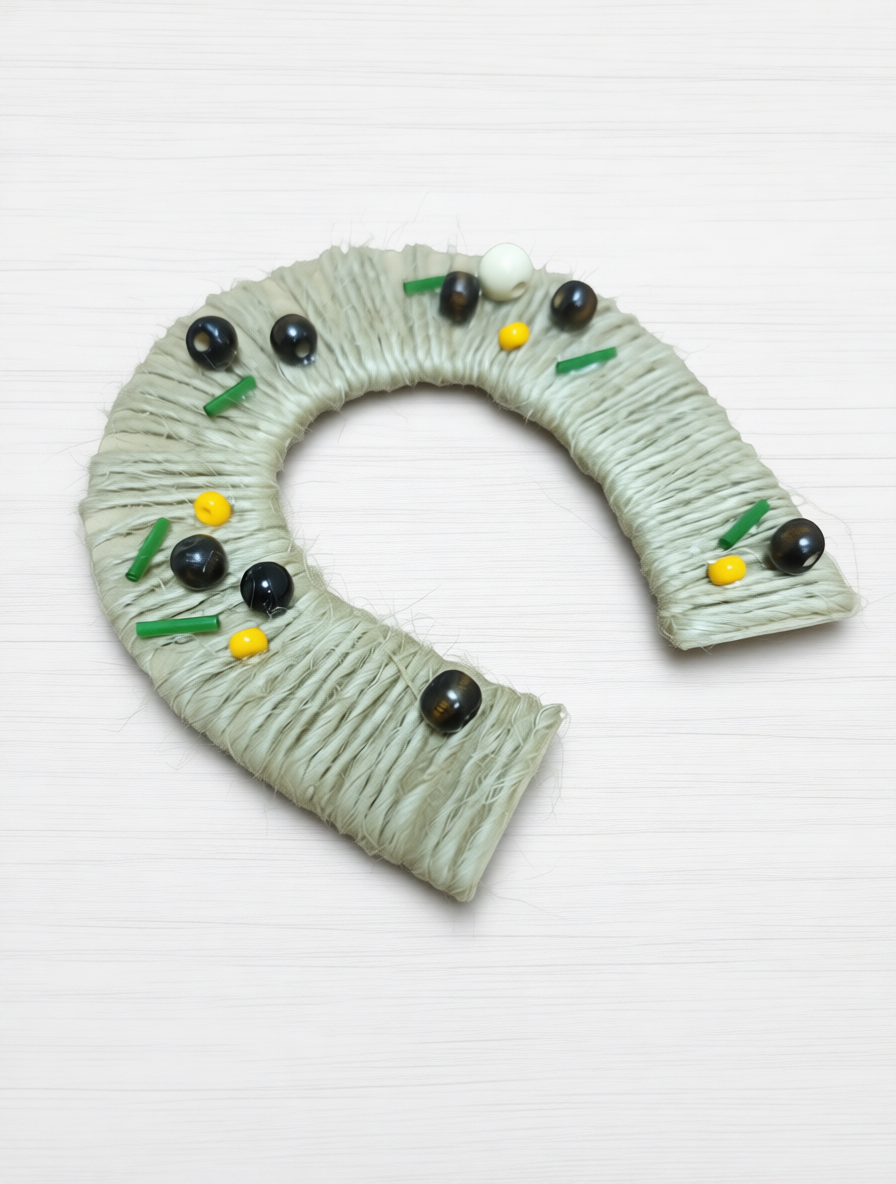 Затем выполним творческое задание по изготовлению поделки под названием "Подкова-оберег". Несложный в исполнении мастер-класс может быть интересен и детям и взрослым. Материалы, которые используются в поделке: джутовая нить средней толщины, бусины, пуговицы.
