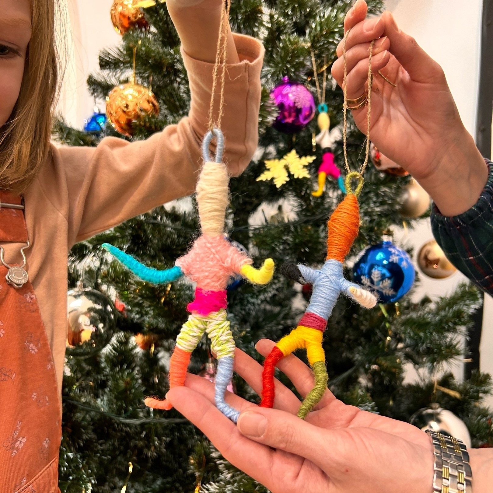 Во время творческого мастер-класса предлагаем создать украшения для новогодней елки в супрематическом стиле, используя нитки для вязания и проволоку.