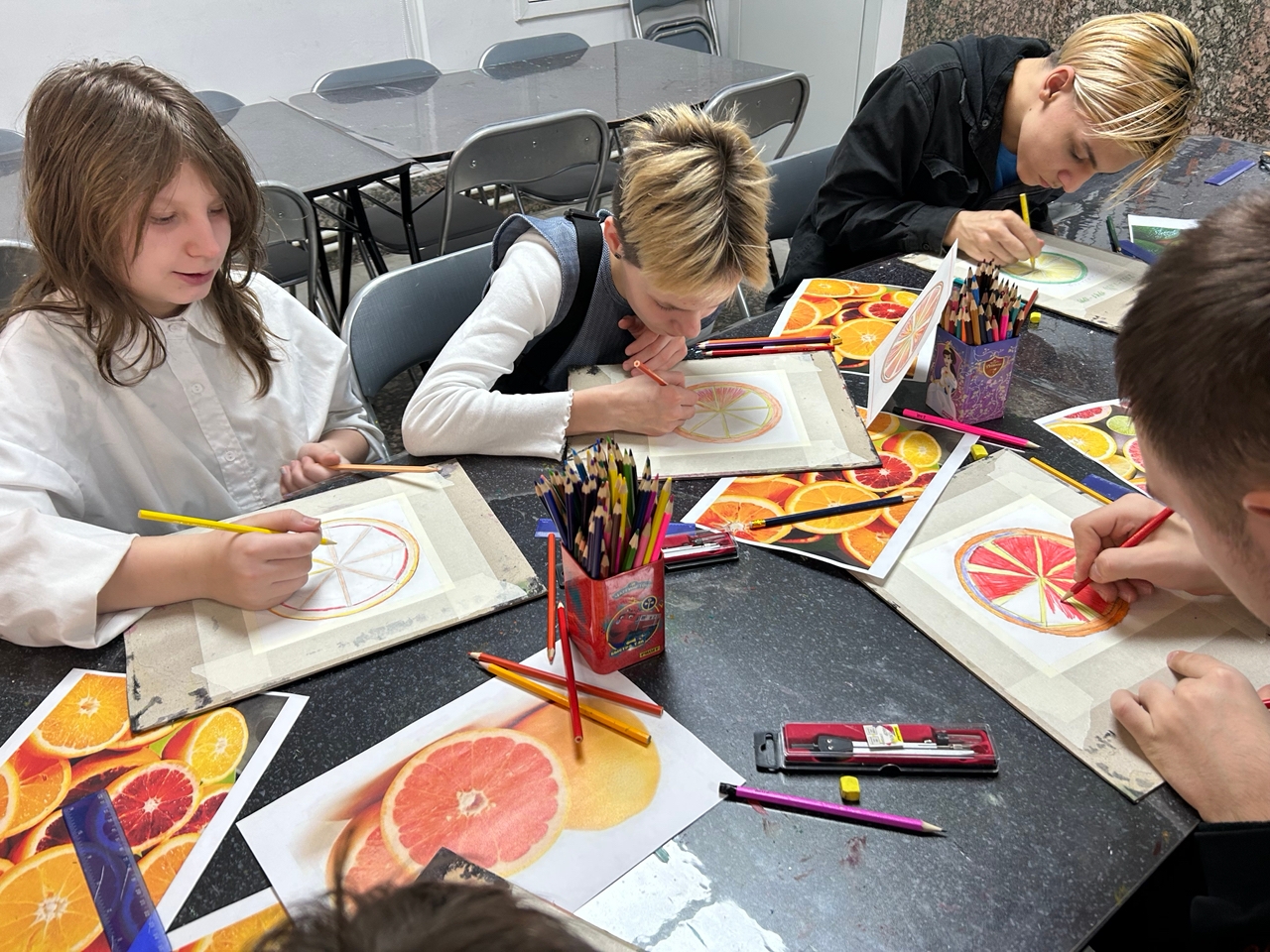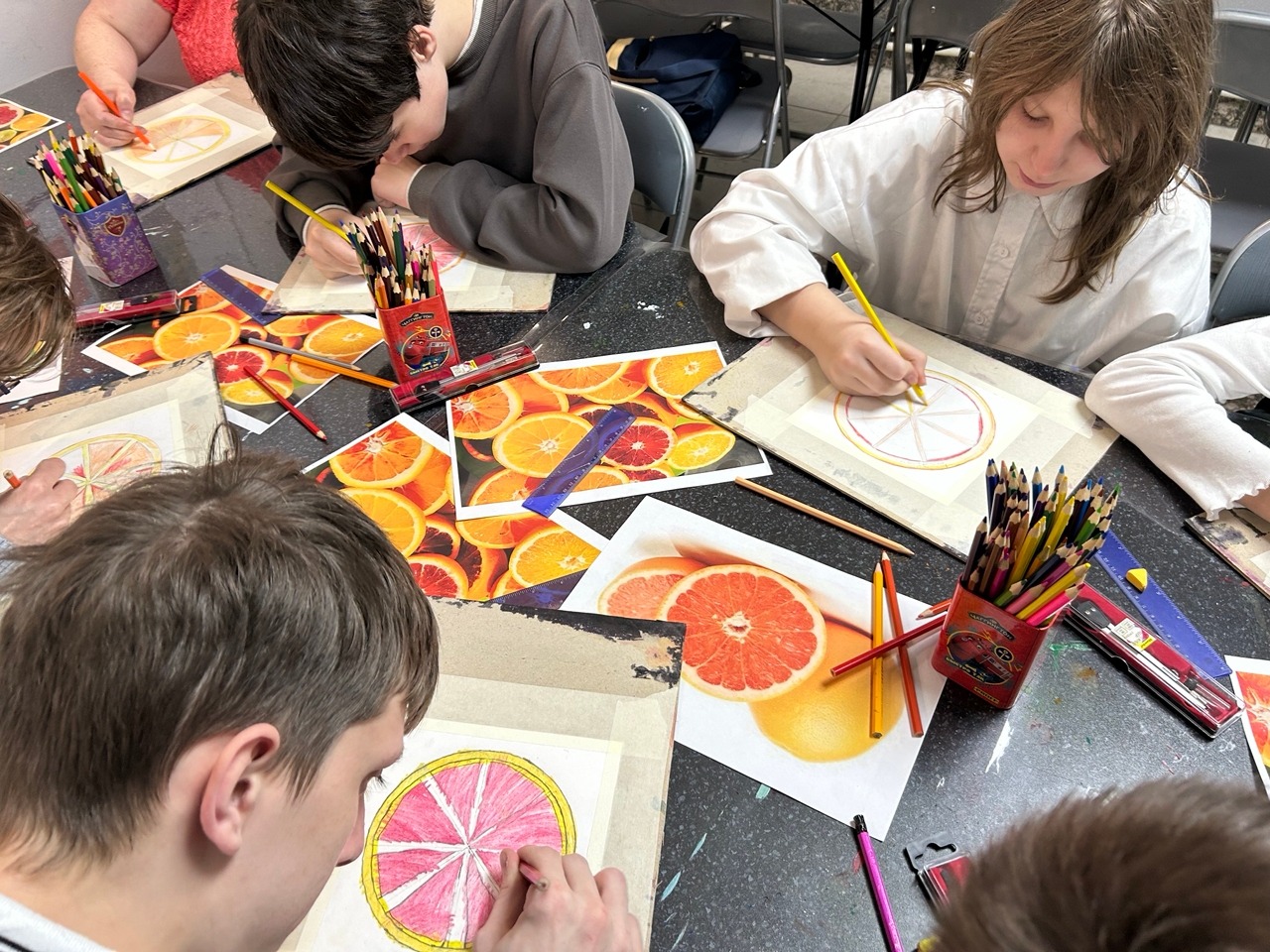 На встрече ребята познакомились с основами карандашной зарисовки и с основными законами создания эскиза при помощи графитного карандаша. После теоретической части, участники приступили к творчеству - создали стилизованный карандашный рисунок тех цитрусовых фруктов, которые им больше всего нравятся: мандаринов, апельсинов или грейпфрутов.