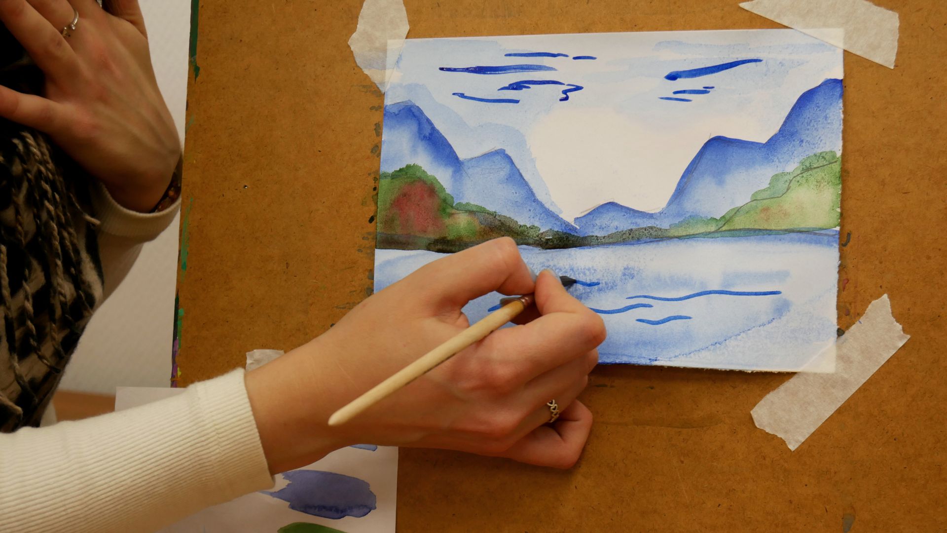 На занятии гостьи рисовали акварельный пейзаж в технике по сырому. Тема пейзажа – горы, горный массив. Целью занятия было понять, как ведут себя акварельные краски на мокрой бумаге и изучить разноплановость композиции.