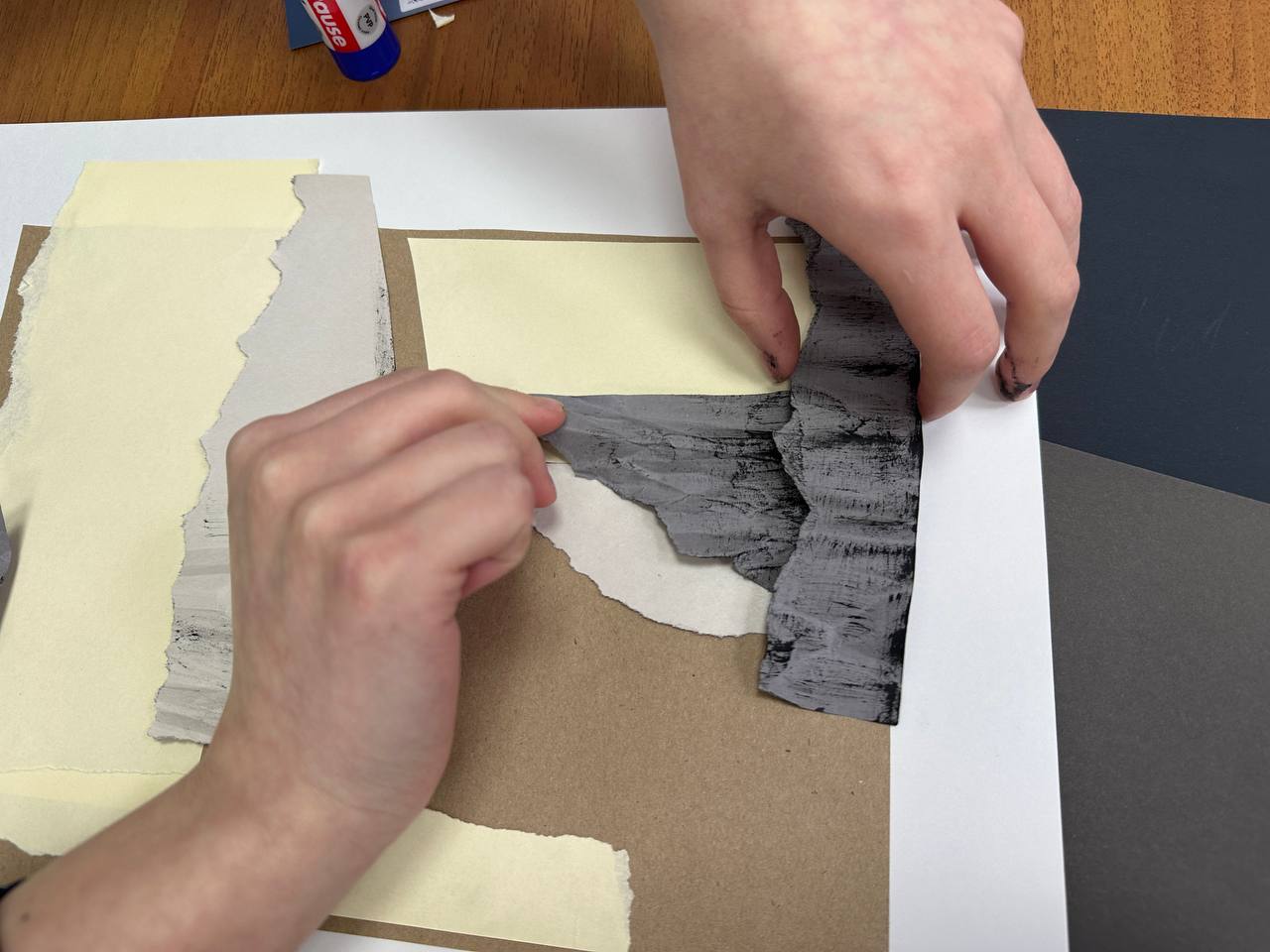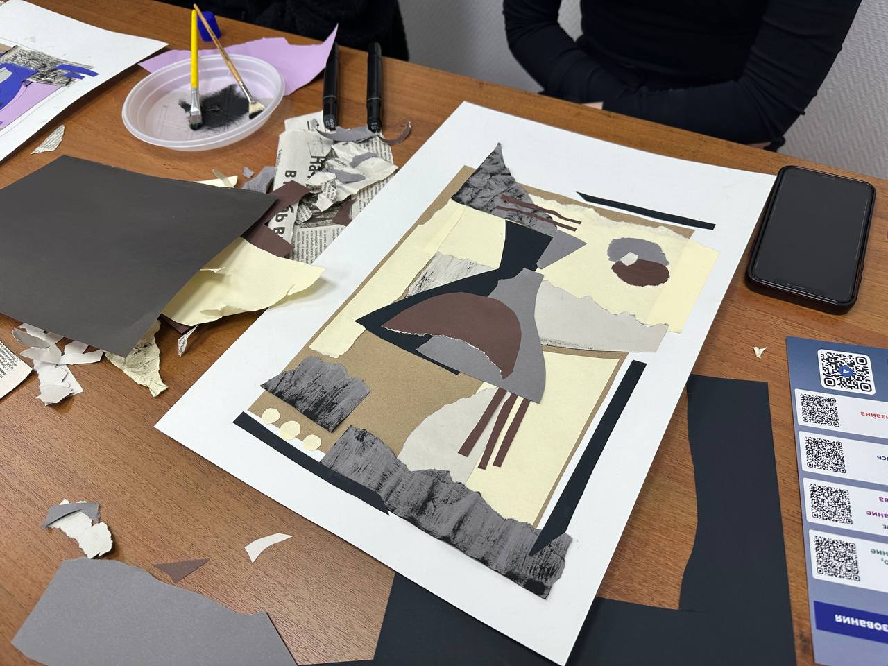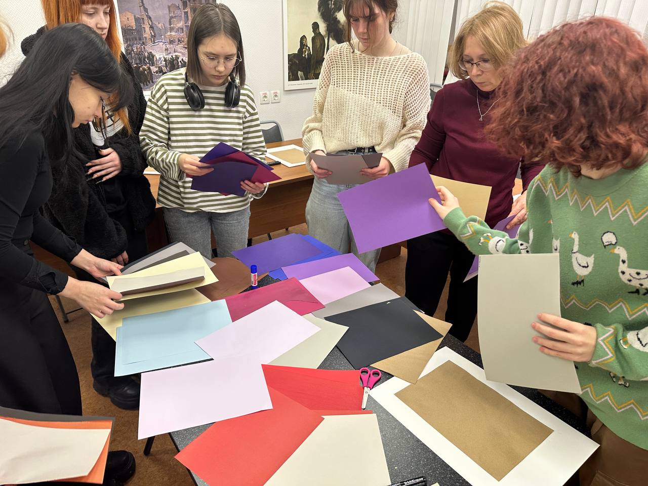Анна Кирилловна рассказала о своем творчестве, о работе со студентами в Санкт-Петербурге. Участникам мастер-класса было предложено из цветной бумаги благородных оттенков, газет и фактурной бумаги составить композицию абстрактного натюрморта. Было очень важно уловить гармоничные цветовые сочетания.