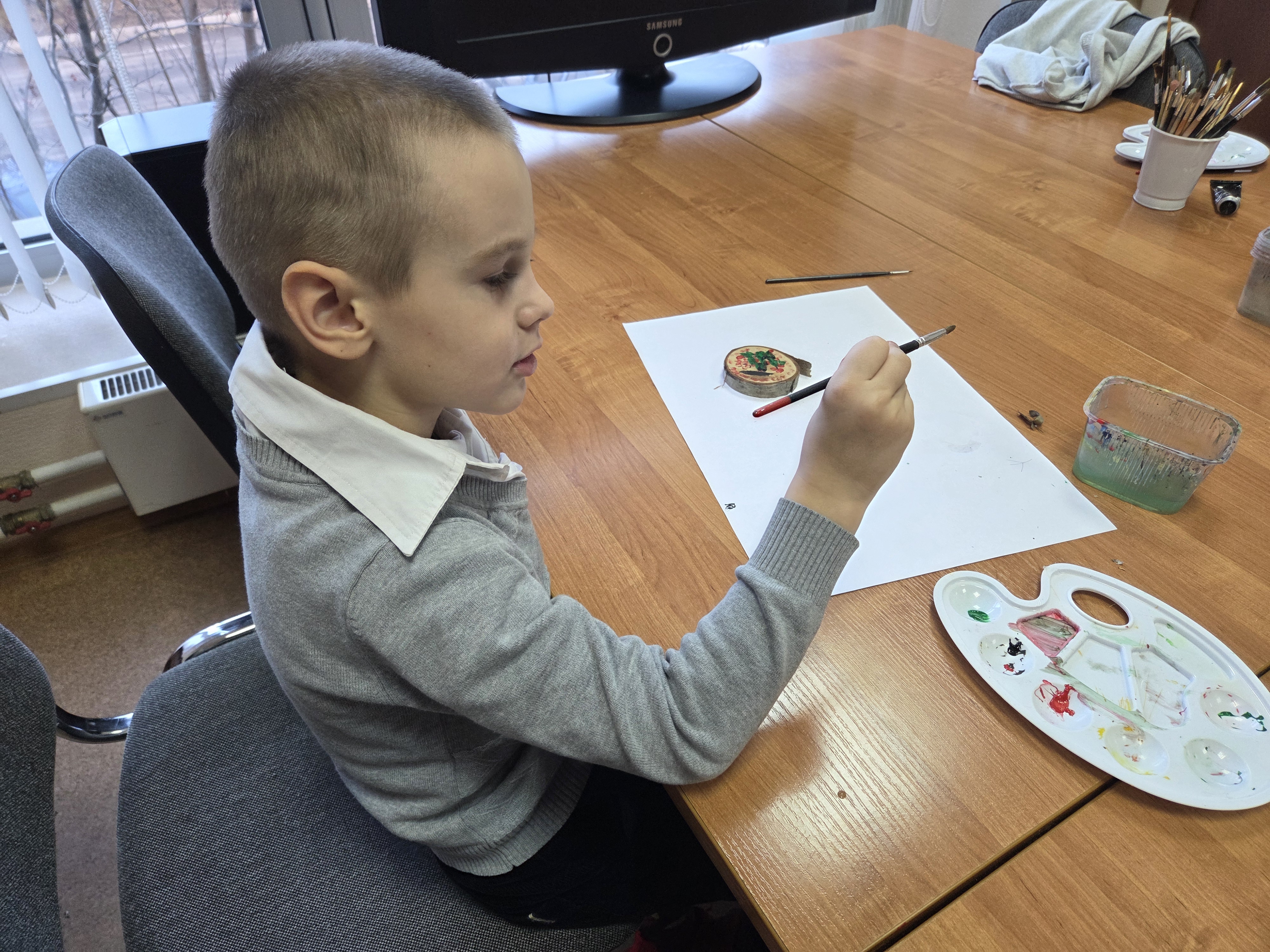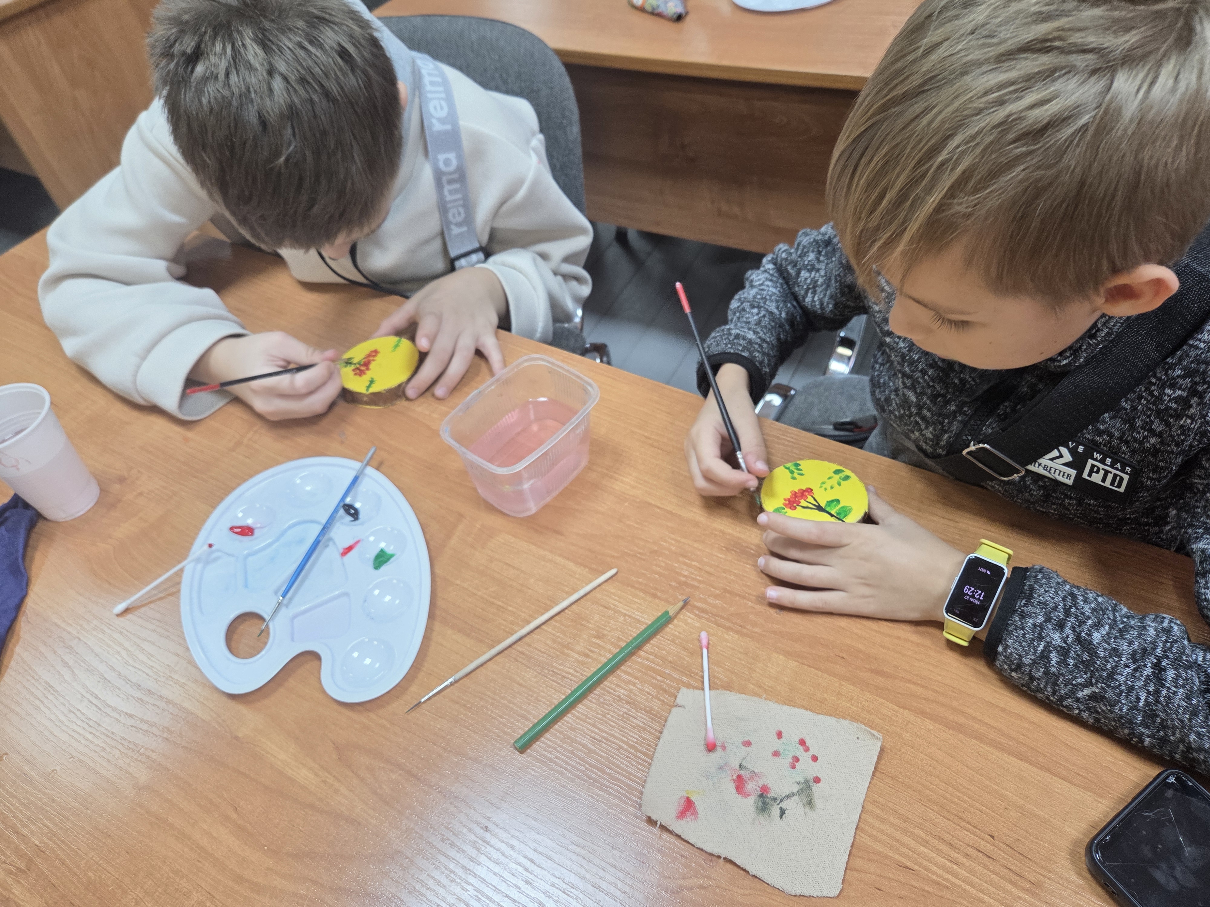 В заключение участники приступили к творческому заданию. Под руководством специалиста на деревянных спилах гости изобразили ветку рябину, используя необычную технику «метод тычка»