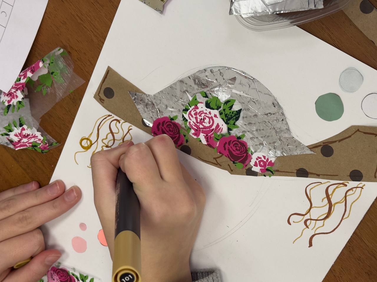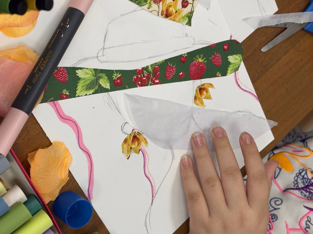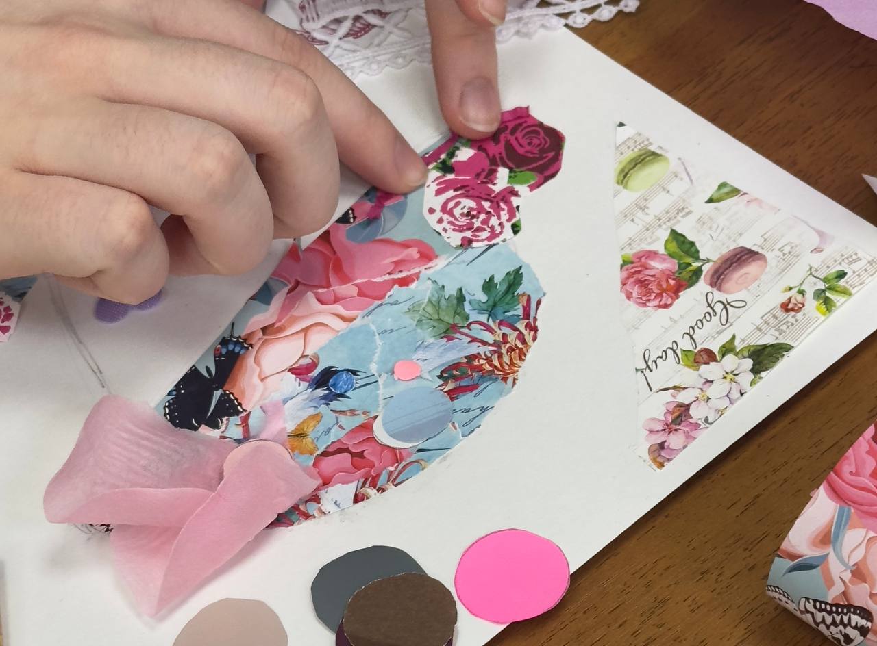 Особое внимание привлекла работа девочек над созданием коллажа. Они собрали композицию шляпы, проявив фантазию и креативность. Получился настоящий живой фактурный коллаж, отражающий разнообразие форм и стилей головных уборов разных времен.