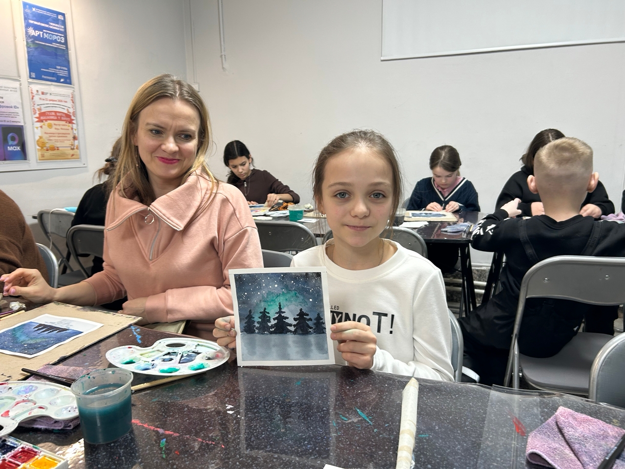 Все участники мастер-класса справились со своей задачей на «отлично», нарисовав в непростой акварельной технике природу нашего края. В ходе работы гости музея применяли различные приемы, такие как «мокрым по мокрому», «лессировку» и даже «смывку». В итоге, каждый ушел с атмосферным зимним пейзажем, подсвеченным эффектным северным сиянием.