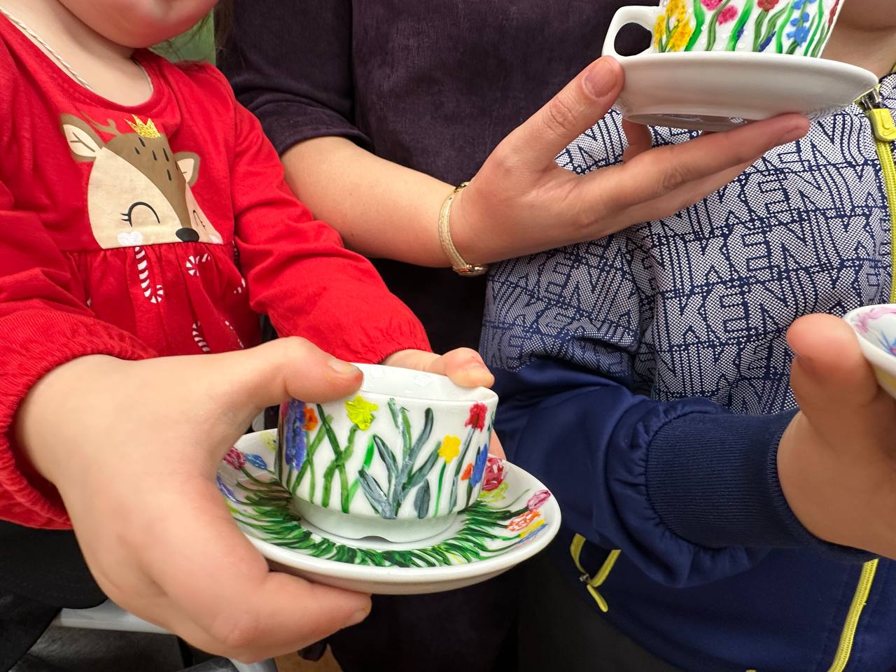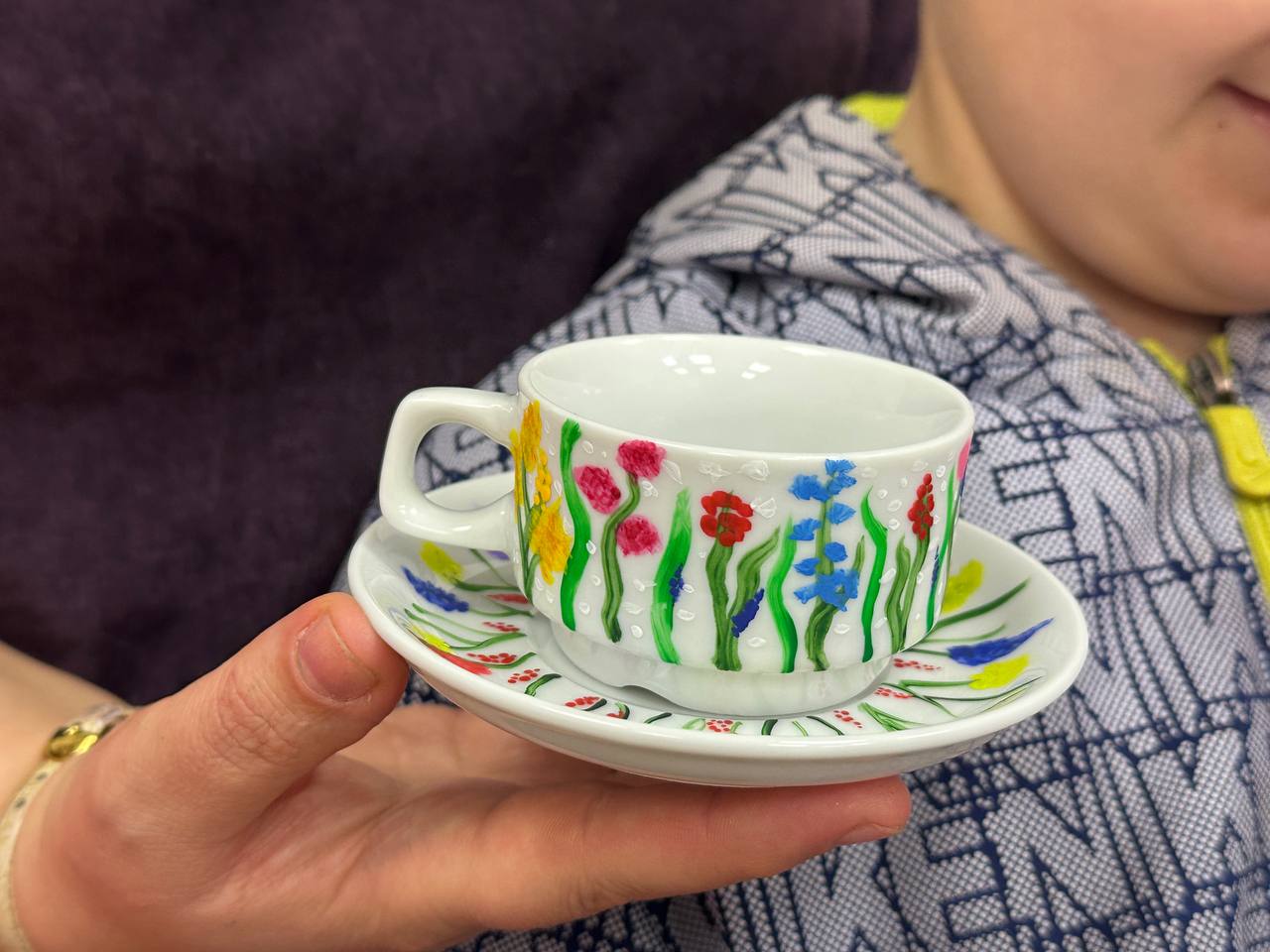Гости с удовольствием окунулись в мир творчества, превращая обычные фарфоровые чашечки и блюдца в настоящие произведения искусства. Атмосфера была тёплой и вдохновляющей: каждый участник сосредоточенно работал над своим изделием, внимательно прорисовывая узоры и уделяя внимание каждой мелочи.
