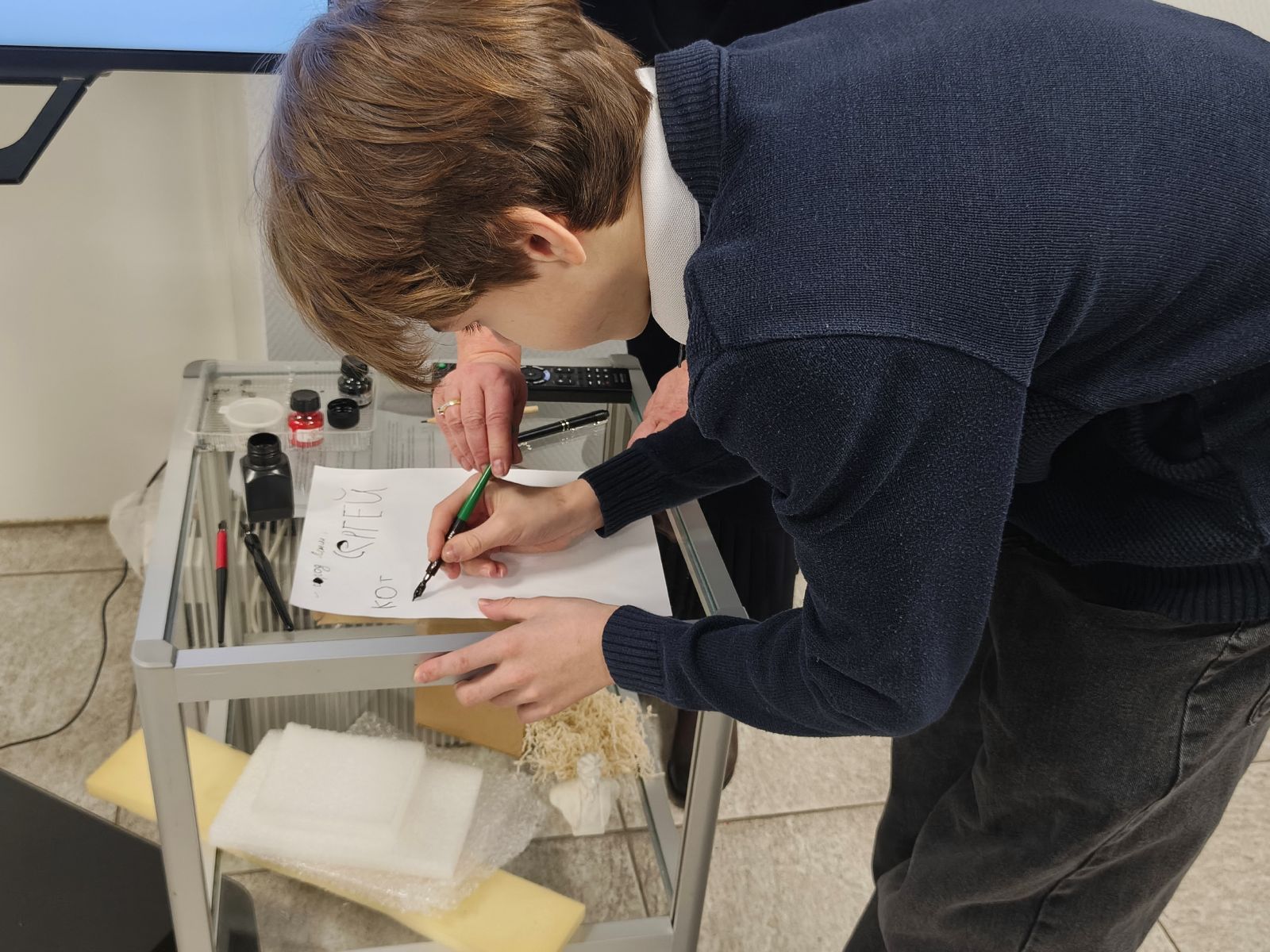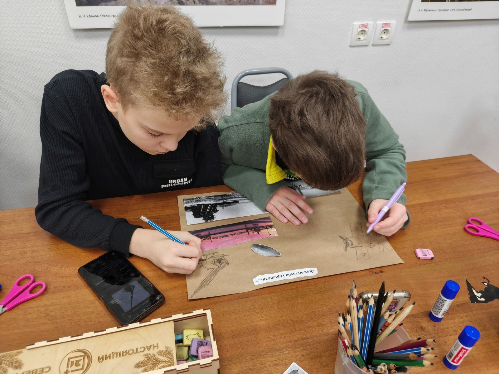 Каждая тема сопровождалась небольшим заданием. Например, выбрать, чем писали на уроках в холодную зиму 1941 года. Или, разделившись на команды, надо упаковать картину и скульптуру для отправки.