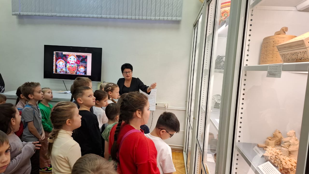 Ребята, посетив зал постоянной экспозиции «Открытое хранение живописи и декоративно-прикладного искусства России», не только ознакомились с многообразием народного творчества, но и узнали историю возникновения матрешки, а также побеседовали о ее видовом разнообразии.