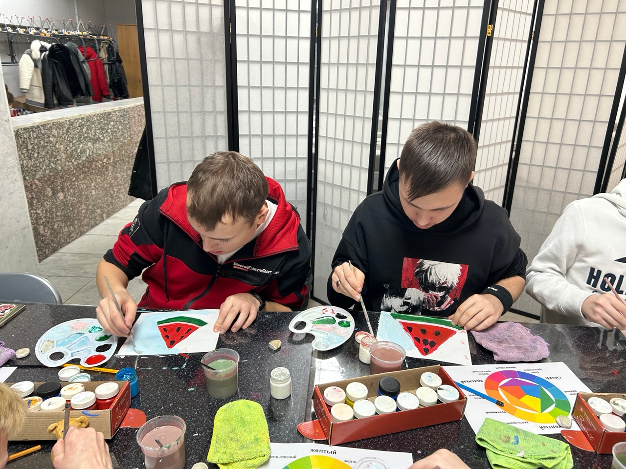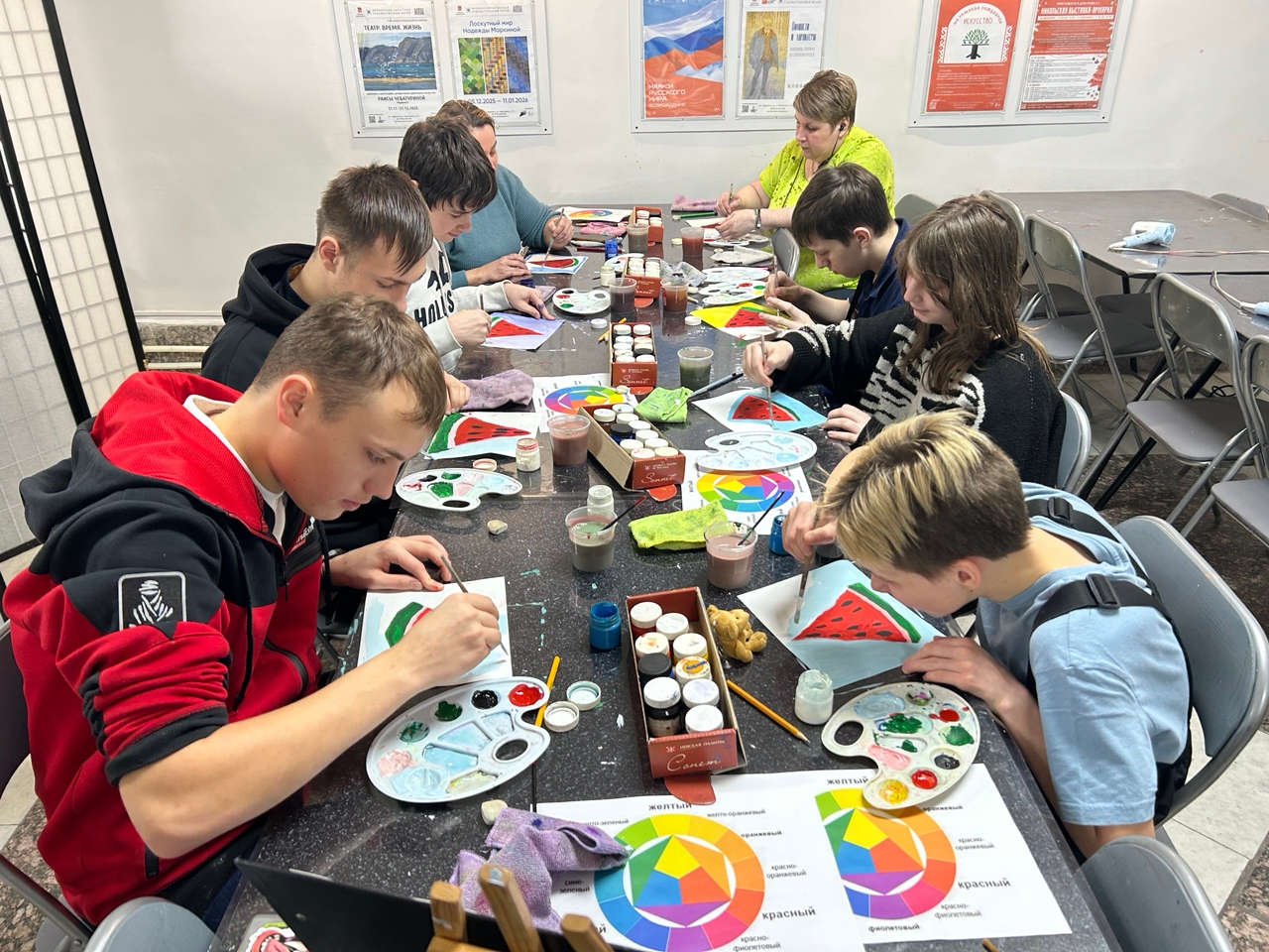 На встрече ребята познакомились с основами колористики и цветообразования. Внимательно изучили цветовой круг и узнали об основных контрастных парах. Основная задача творческой части заключалась в том, чтобы создать рисунок в красно-зеленой контрастной цветовой гамме. Участники встречи отлично справились с поставленной задачей, нарисовав арбузную дольку в технике гуашь.