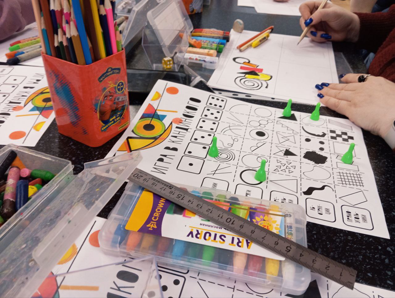 Участники мероприятия проследили эволюцию стиля самого Кандинского и попытались повторить его композиции и импровизации в ходе необычной игры, где каждый новый элемент рисунка определяет бросок игрального кубика.