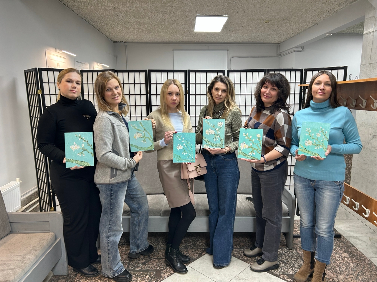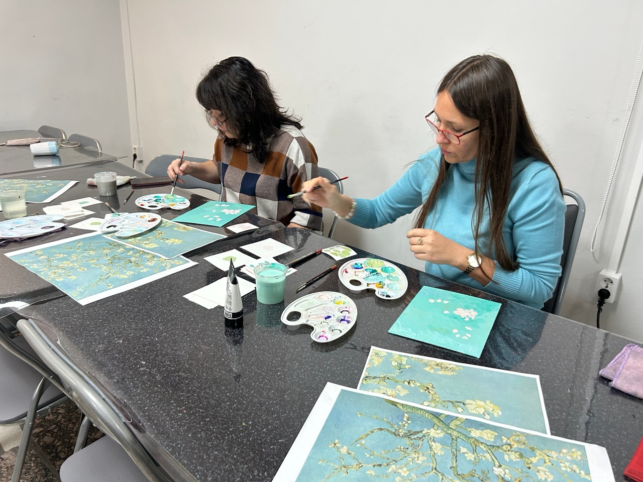 В этот раз на встрече неравнодушных к творчеству людей мы рисовали «Цветущие ветки миндаля». Эта картина была особенной для Винсента Ван Гога, ведь он написал ее в честь рождения его племянника и тезки, сына его брата Тео. Как выяснилось, особенной она оказалась не только для художника, но и для прекрасных участниц мастер-класса. Каждая гостья музея с трепетом подбирала и оттенок бирюзового для неба, и нежный розовый для цветков и бутонов, и холодный оливковый для ветвей… Итогом встречи стали чудесные картины, пропитанные духом Винсента Ван Гога.