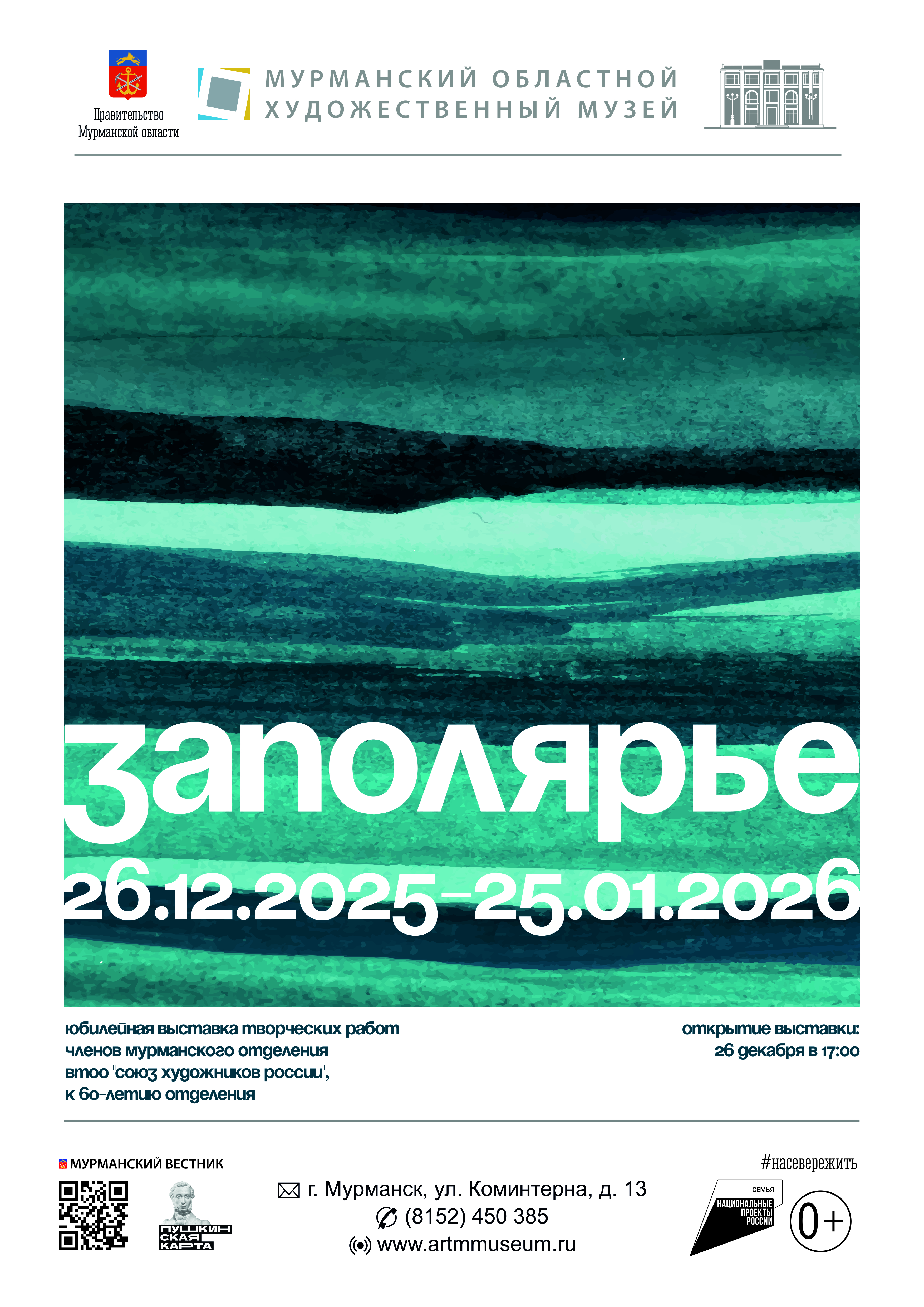 «Заполярье» - выставка творческих работ членов Мурманского отделения Всероссийской творческой общественной организации "Союз художников России", приуроченная к знаменательной дате — 60-летию отделения. Это выставка - итог многолетней работы мастеров изобразительного и декоративно-прикладного искусства Кольского края, демонстрируя не только широту художественных направлений, но и уникальность каждого автора.
