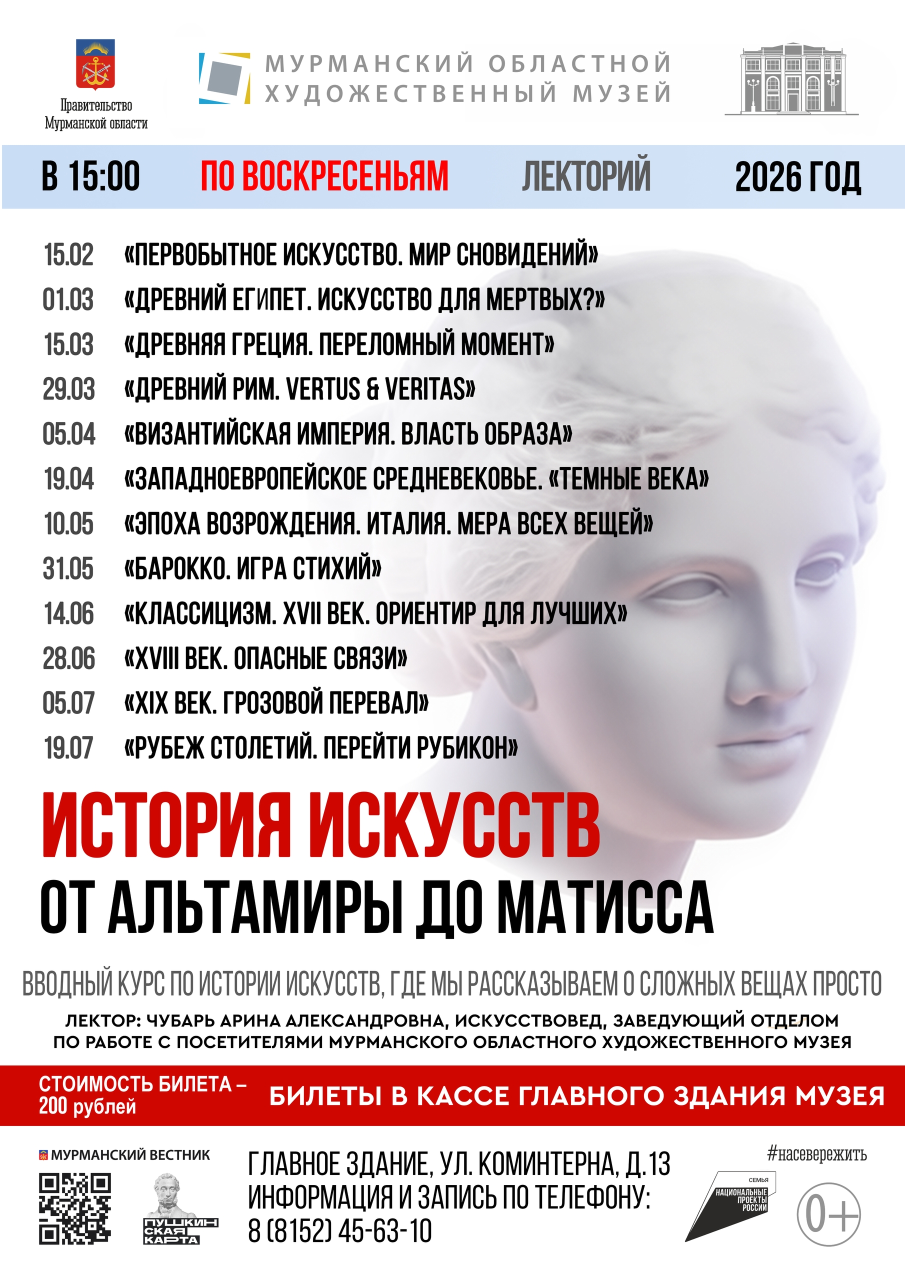 Цикл лекций «История искусств. От Альтамиры до Матисса» — это вводный курс, где мы рассказываем о сложных вещах просто. Посетив лекции этого курса, вы сможете ориентироваться в мире изобразительного искусства, различать художественные стили и направления, узнавать наиболее известные произведения и называть их авторов.