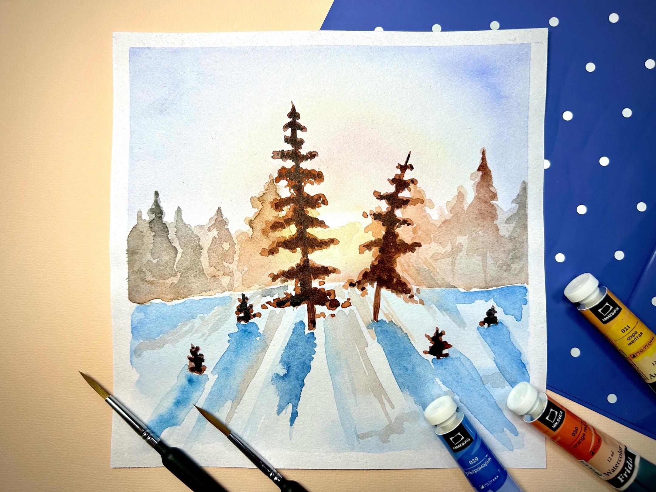На мастер-классе мы познакомимся с таким приемом, как лессировка - способом нанесения акварели полупрозрачными мазками, один слой поверх другого. Этот способ нанесения краски на бумагу, придаст рисунку глубины и выразительности в изображении лесного пейзажа, залитого солнечным светом в мороз.