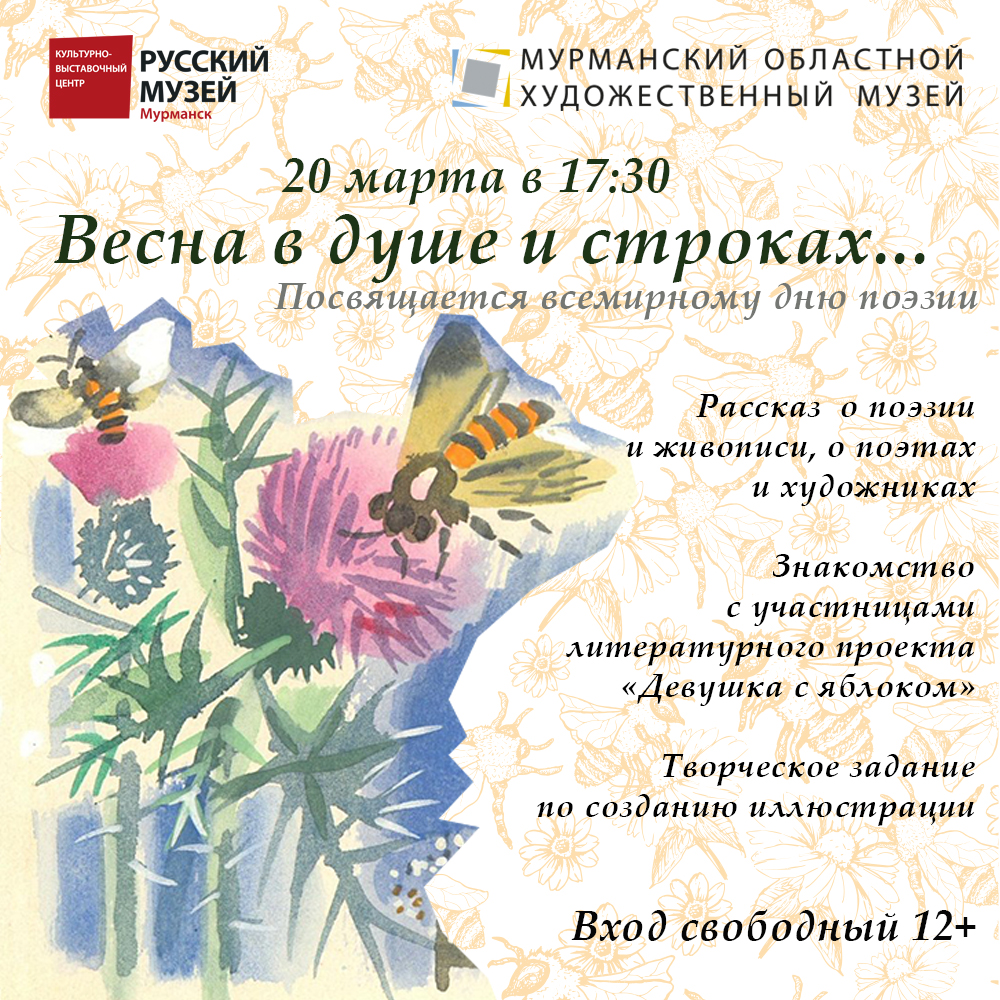 Живопись или поэзия оказывает более сильное эмоциональное воздействие на человека? Да и важно ли это? Приглашаем в пятницу, 20 марта в 17:30 присоединиться ко встрече, посвященной Международному дню поэзии, и порассуждать об этом с интересными мурманскими поэтессами! 12+