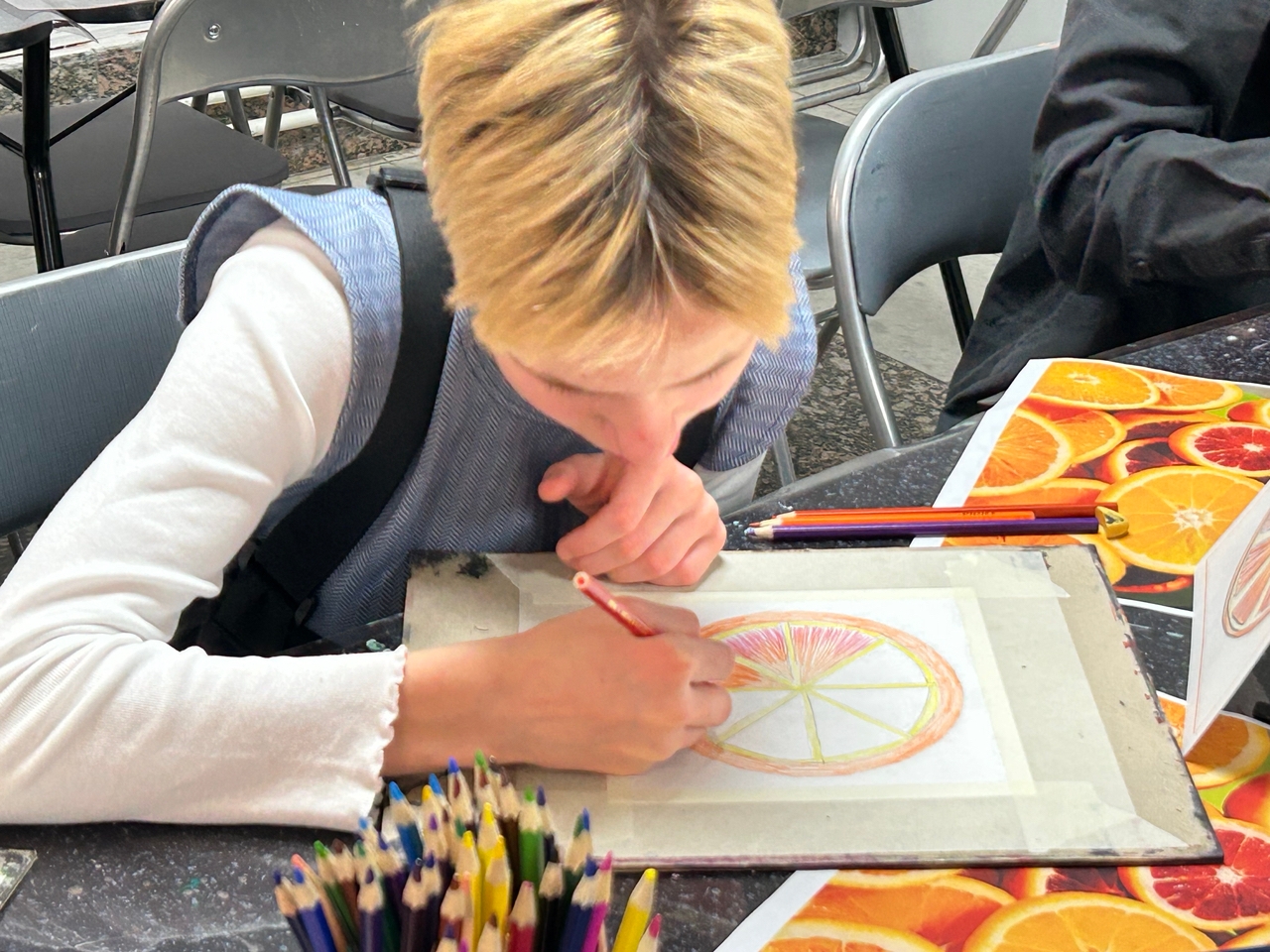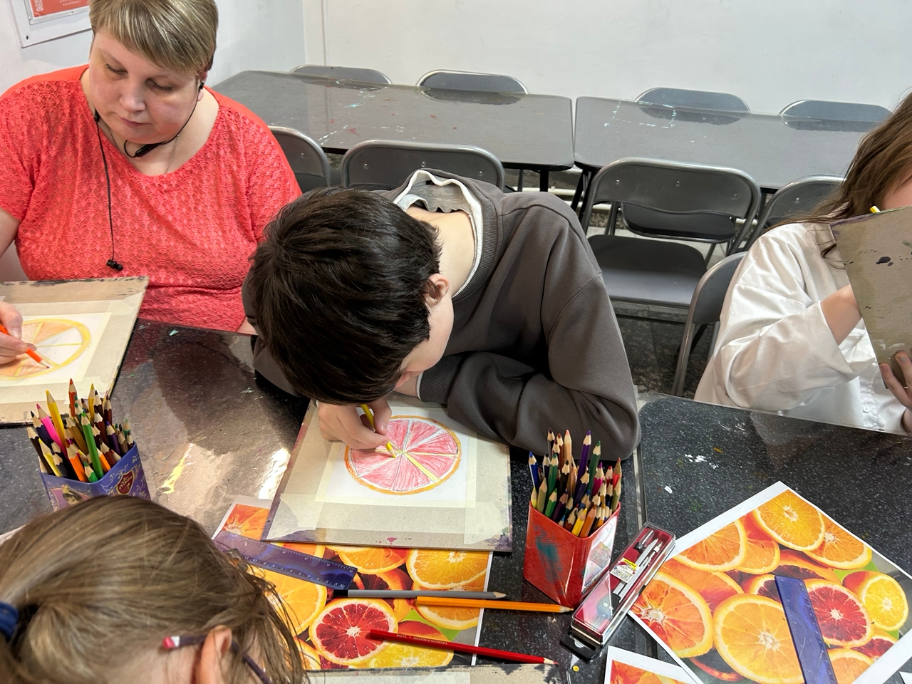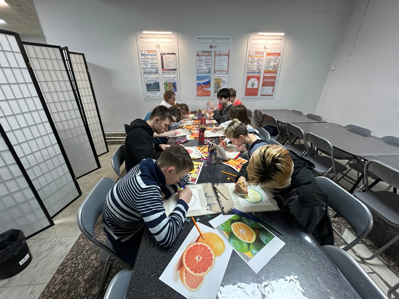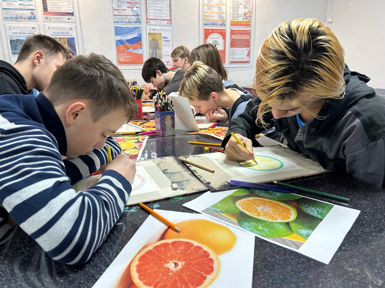 На встрече ребята познакомились с основами карандашной зарисовки и с основными законами создания эскиза при помощи графитного карандаша. После теоретической части, участники приступили к творчеству - создали стилизованный карандашный рисунок тех цитрусовых фруктов, которые им больше всего нравятся: мандаринов, апельсинов или грейпфрутов.