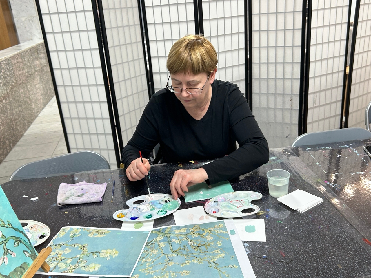 Картина «Цветущие ветки миндаля» была особенной для Винсента Ван Гога, ведь он написал ее в честь рождения его племянника и тезки, сына его брата Тео. Как выяснилось, особенной она оказалась не только для художника, но и для участников мастер-класса. Каждый гость музея с трепетом подбирала и оттенок бирюзового для неба, и нежный розовый для цветков и бутонов, и холодный оливковый для ветвей… Итогом встречи стали чудесные картины, пропитанные духом Винсента Ван Гога.