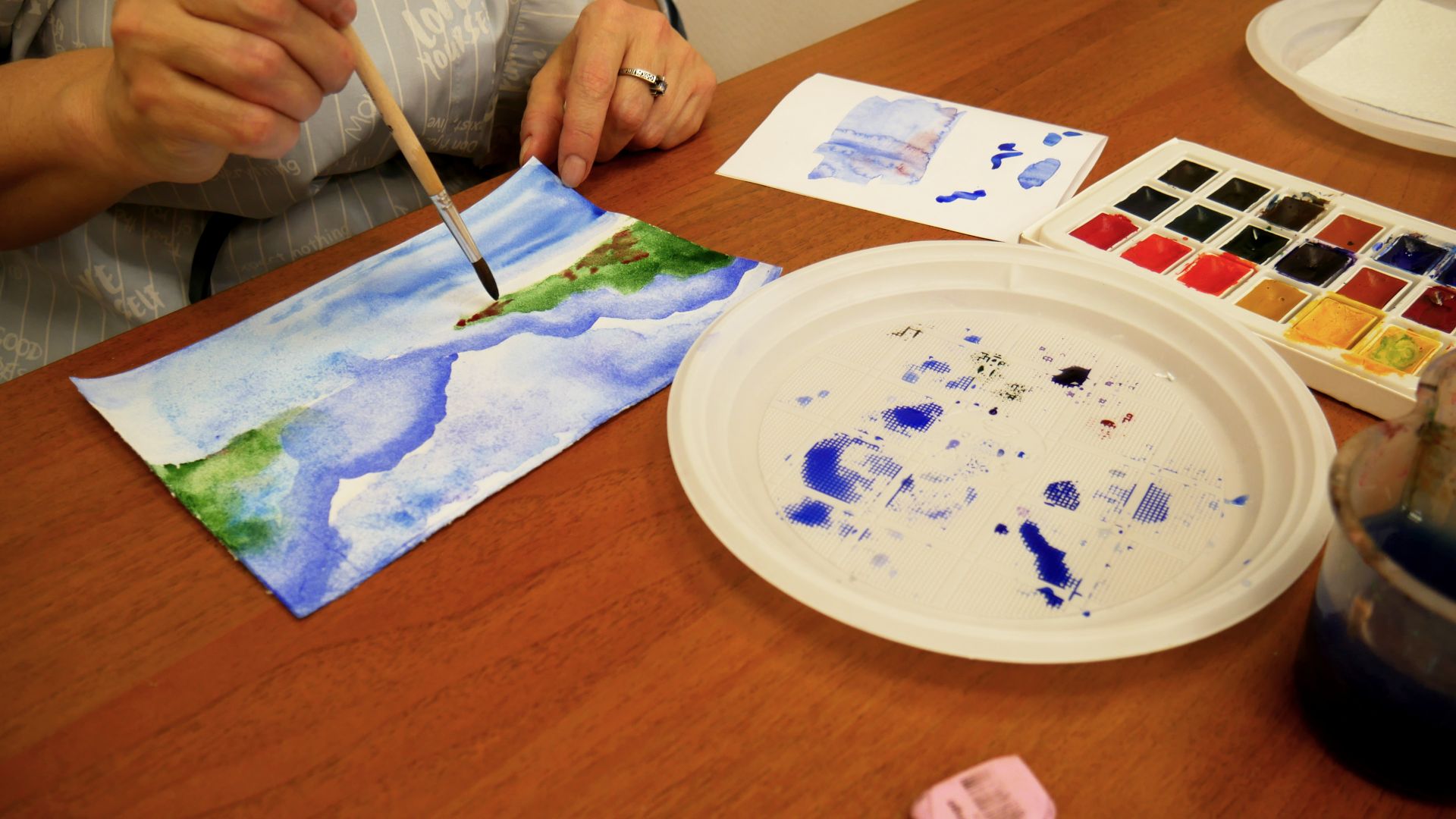 На занятии гостьи рисовали акварельный пейзаж в технике по сырому. Тема пейзажа – горы, горный массив. Целью занятия было понять, как ведут себя акварельные краски на мокрой бумаге и изучить разноплановость композиции.
