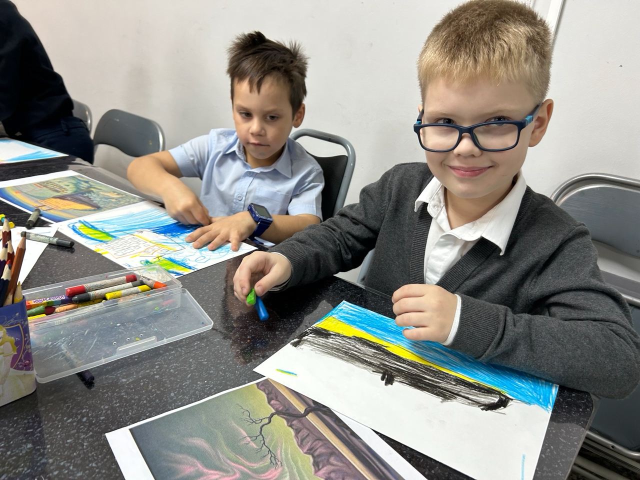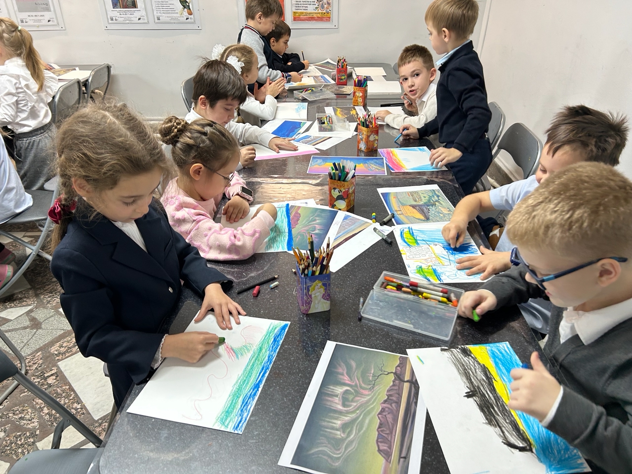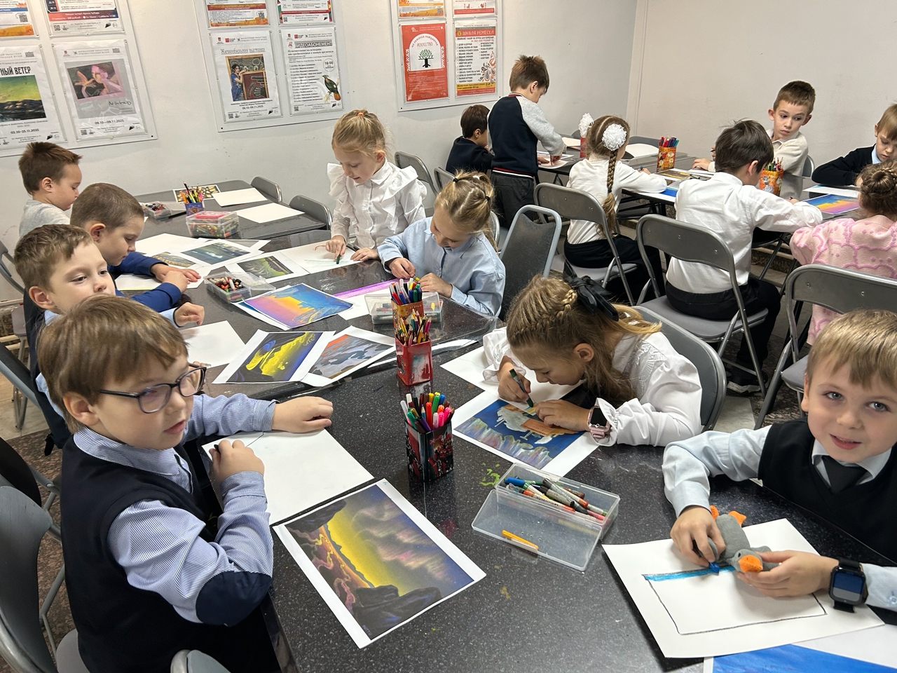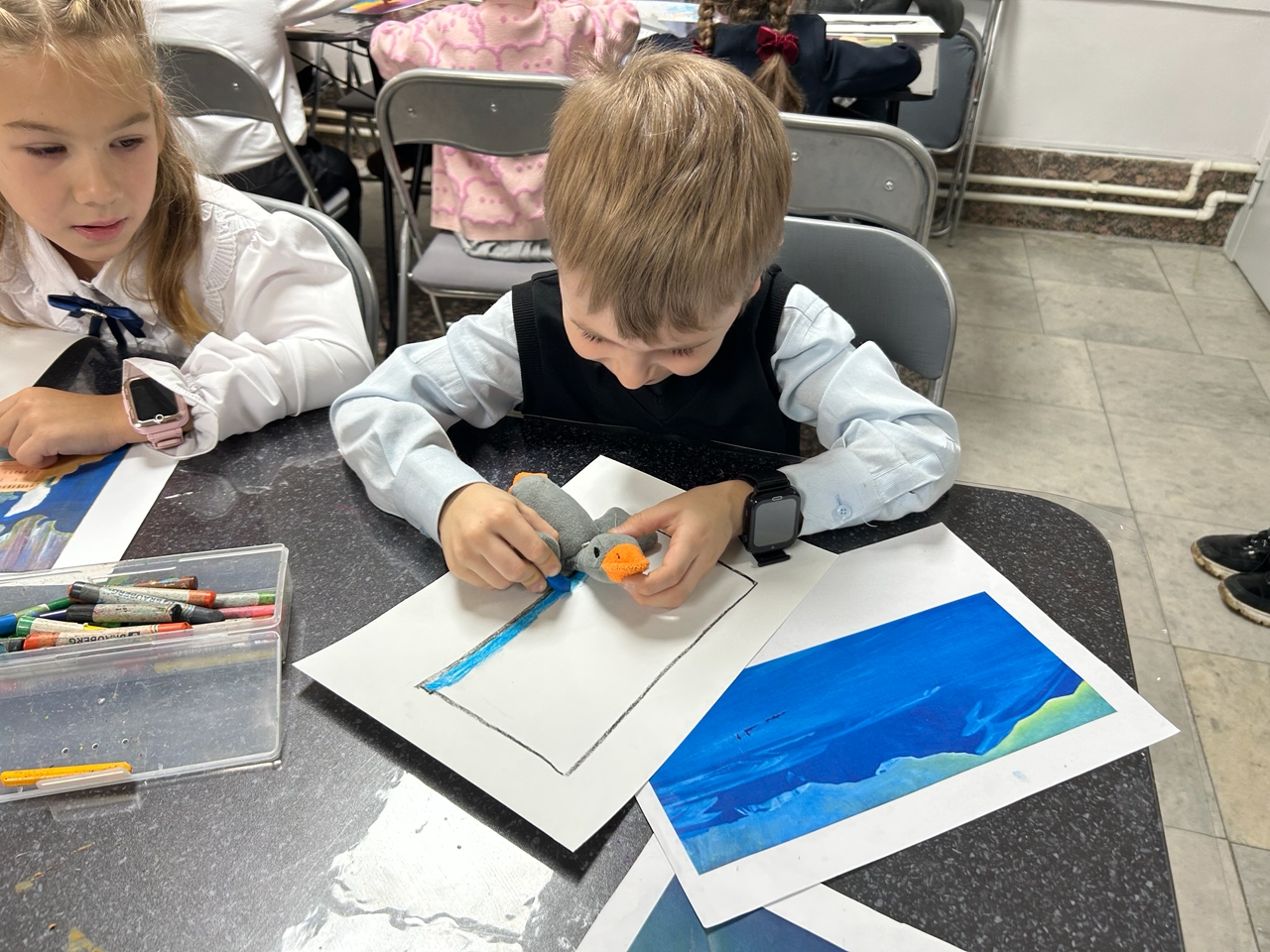 Музейный урок завершился творческим заданием, в ходе выполнения которого ребята повторили арктические пейзажи, работая масляной пастелью.