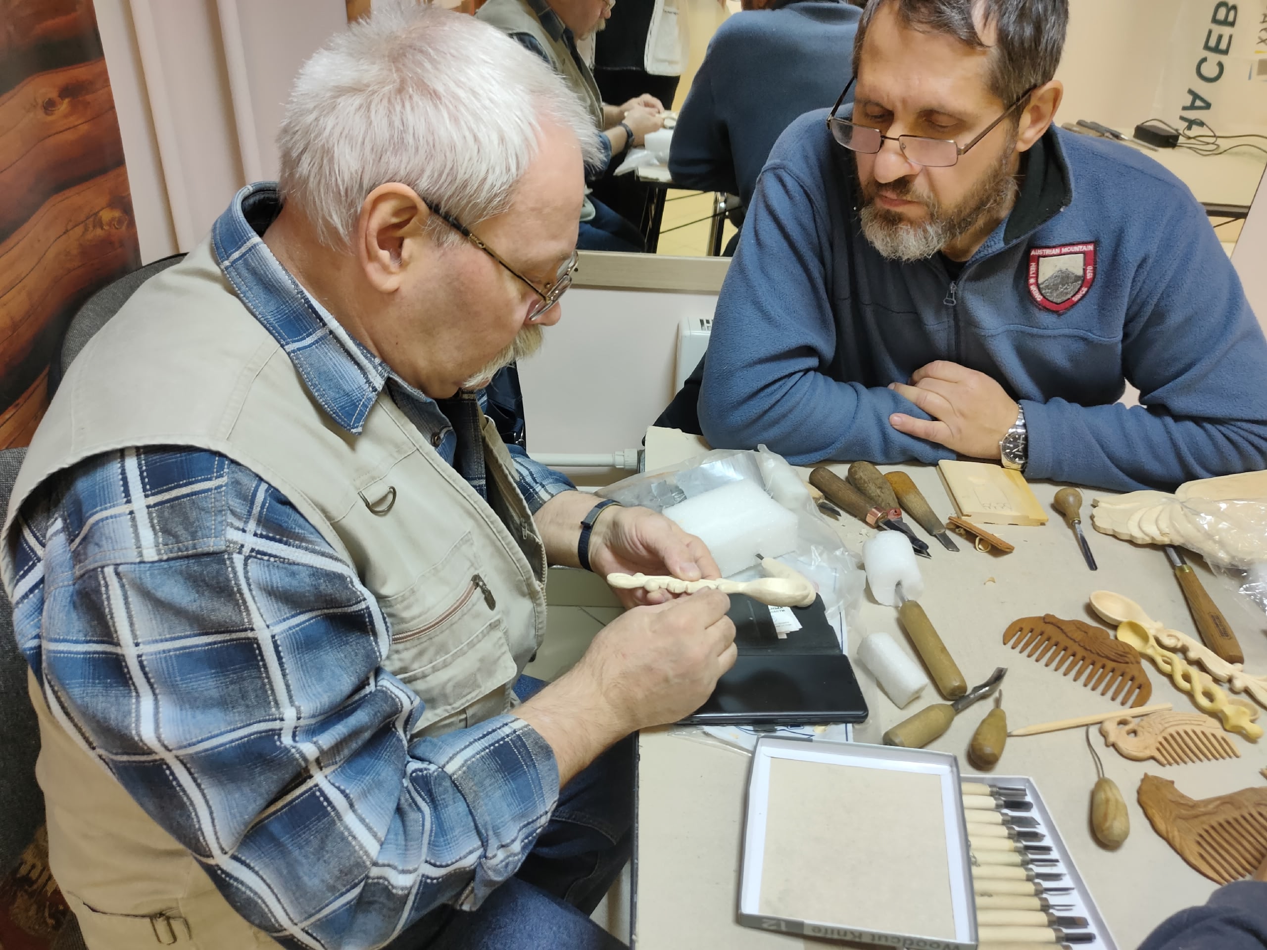 Мастер своего дела Александр Юрьевич Степанов продемонстрировал виртуозное владение стамеской и резцом, превращая обычные куски дерева в настоящие произведения искусства.