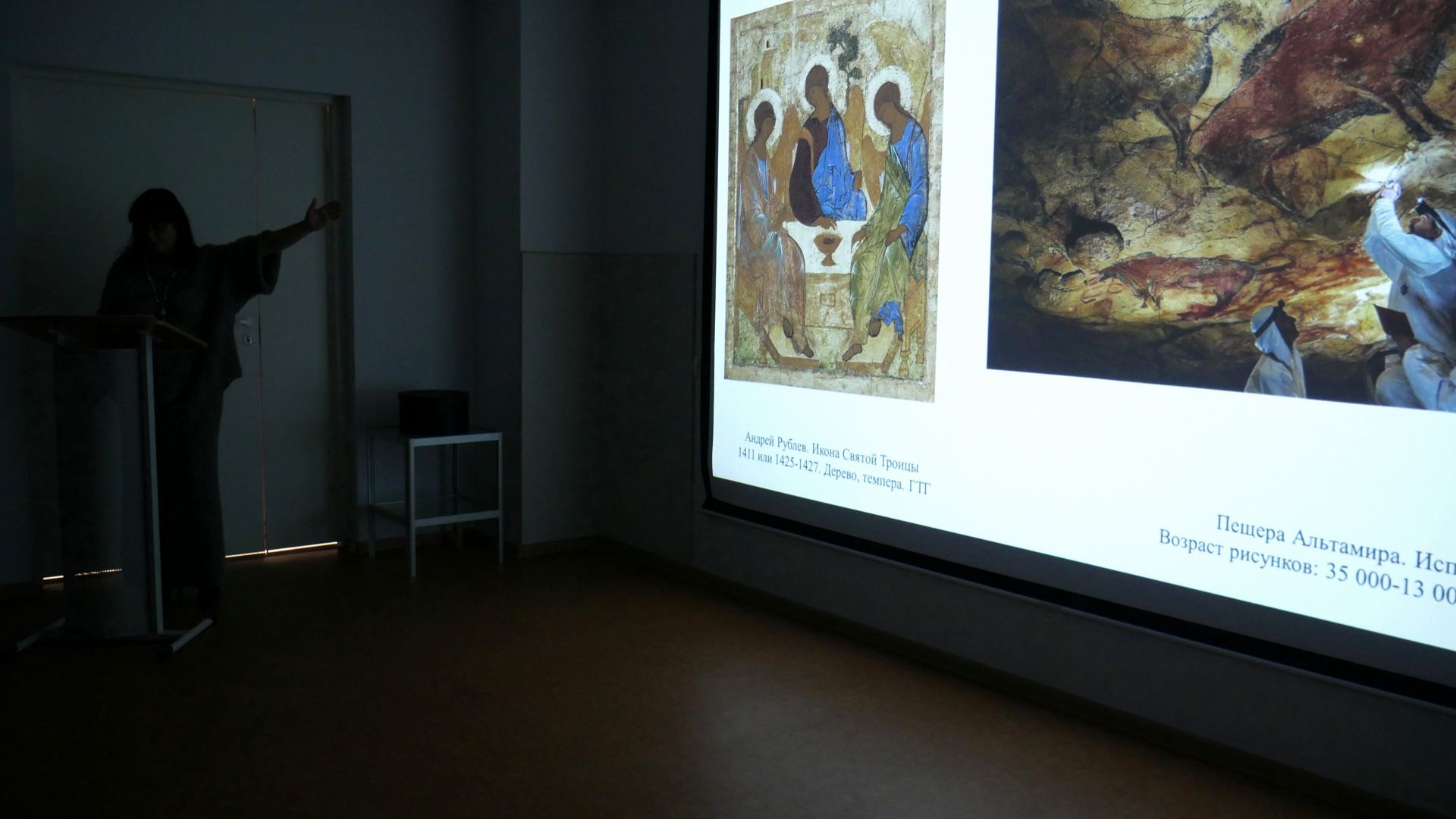 Далее командам предлагалось выполнить задания. Например, «Аукцион» – нужно было записать предложенные картины в порядке возрастания их стоимости на мировых аукционах. Трудной загадкой для участников стал «Черный ящик» – как предметы, находящиеся в нем связаны с живописью. С большим энтузиазмом ребята попробовали себя в роли экскурсовода по одной картине, выпавшей в задании «25 кадр».