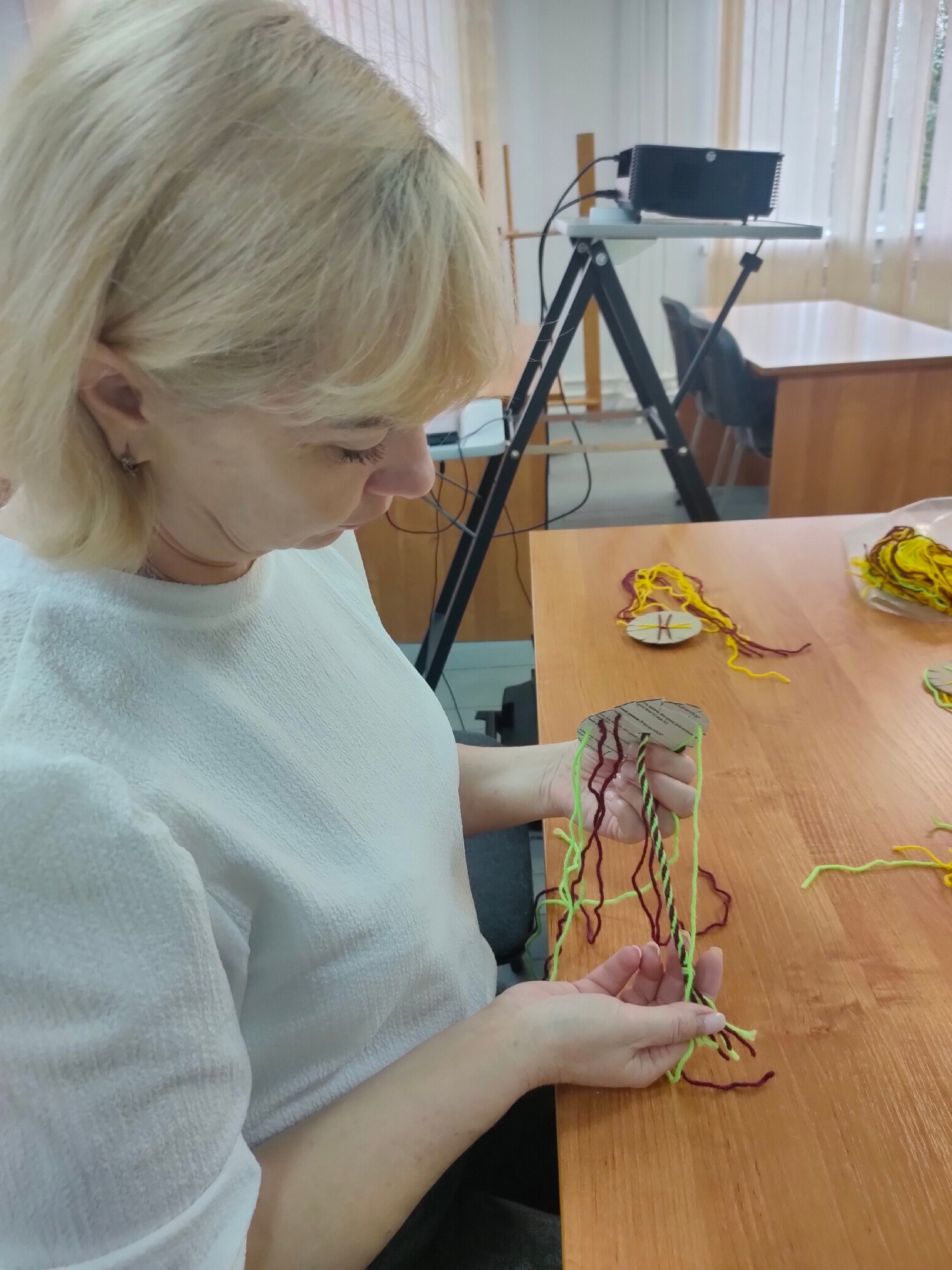 Специалист отдела познакомила присутствующих с историей кумихимо, с зарождением и развитием это искусства, рассказала, как использовали и применяли готовые изделия, затем помогла разобраться со схемами и принципом работы с ними, научила подбирать материал для плетения, а также наглядно продемонстрировала процесс работы на специальном приспособлении.