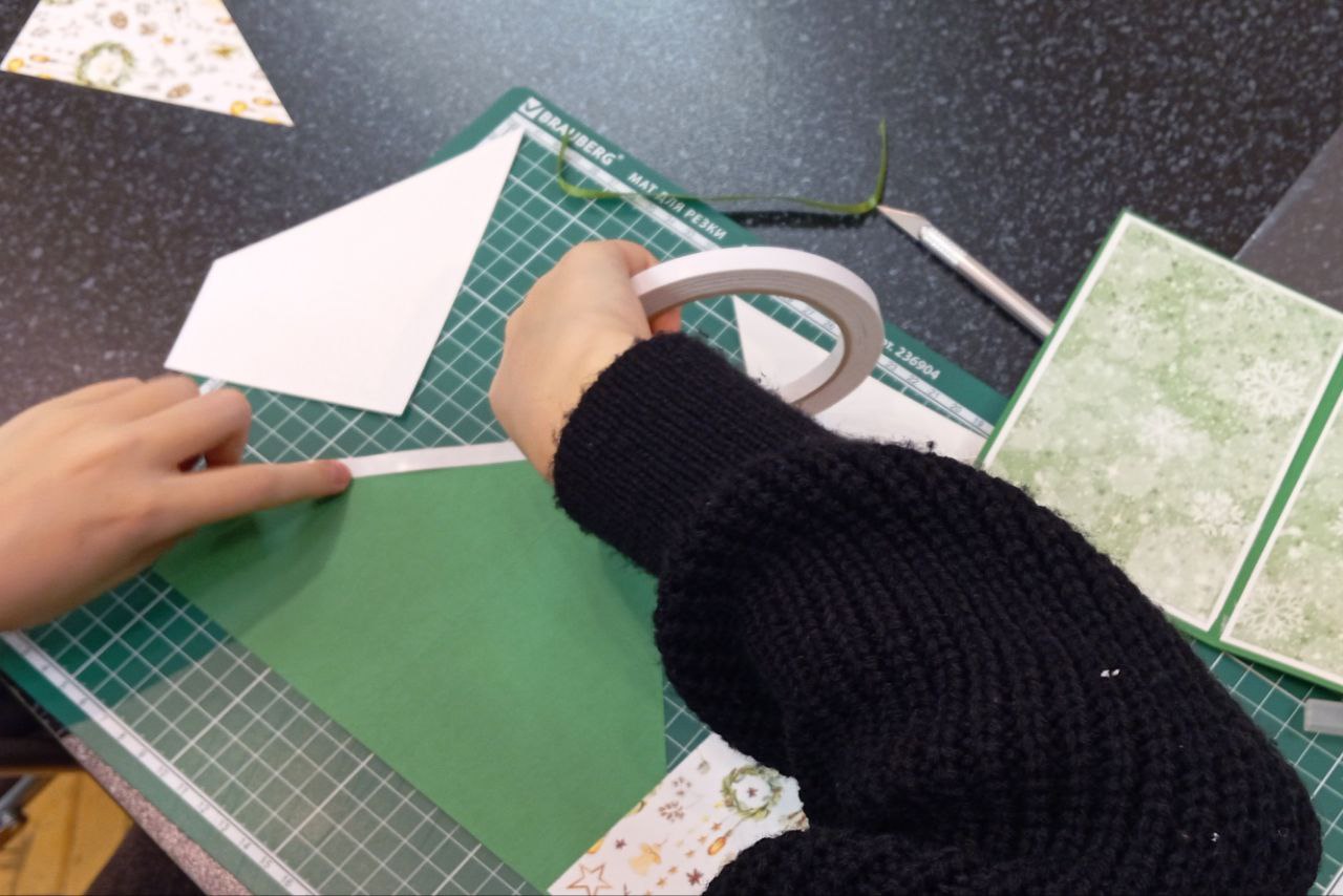 Участники мастер-класса создали оригинальные новогодние открытки из плотной цветной бумаги. Однотонная основа открытки декорировалась тематически украшенной плотной бумагой, а внутренняя часть составлялась с помощью сложного элемента «гармошка». К открытке также были добавлены вкладыши-комплименты с тёплыми пожеланиями. Готовая открытка обязательно порадует родных и близких в зимние праздники.