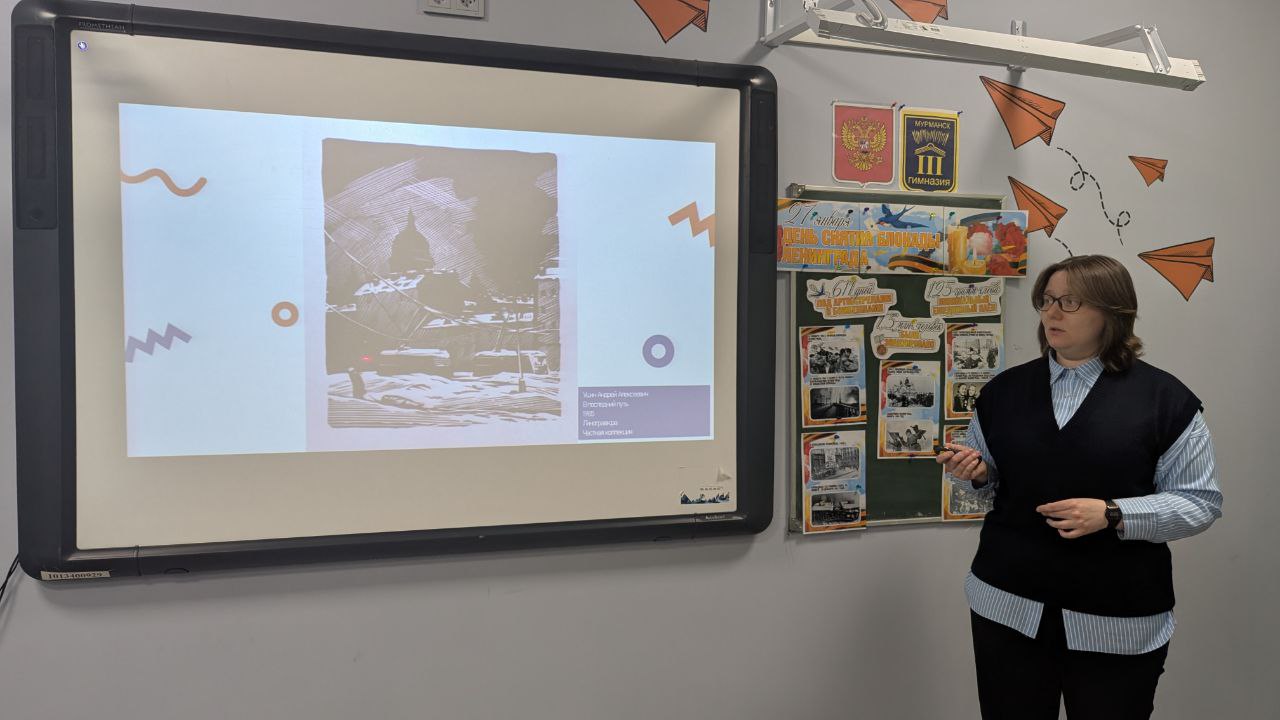 В ходе урока шестиклассники вспомнили ключевые факты об истории одного из самых трагичных периодов не только Великой Отечественной войны, но и летописи нашей страны в целом. Ребята прикоснулись к тяжёлым воспоминаниям одного из жителей блокадного Ленинграда - художника-графика Андрея Алексеевича Ушина. В работах мастера линогравюры человеческие судьбы тесно вплетены в ландшафт города, рядом с фигурами людей всегда присутствуют очертания знаковых зданий Северной столицы.