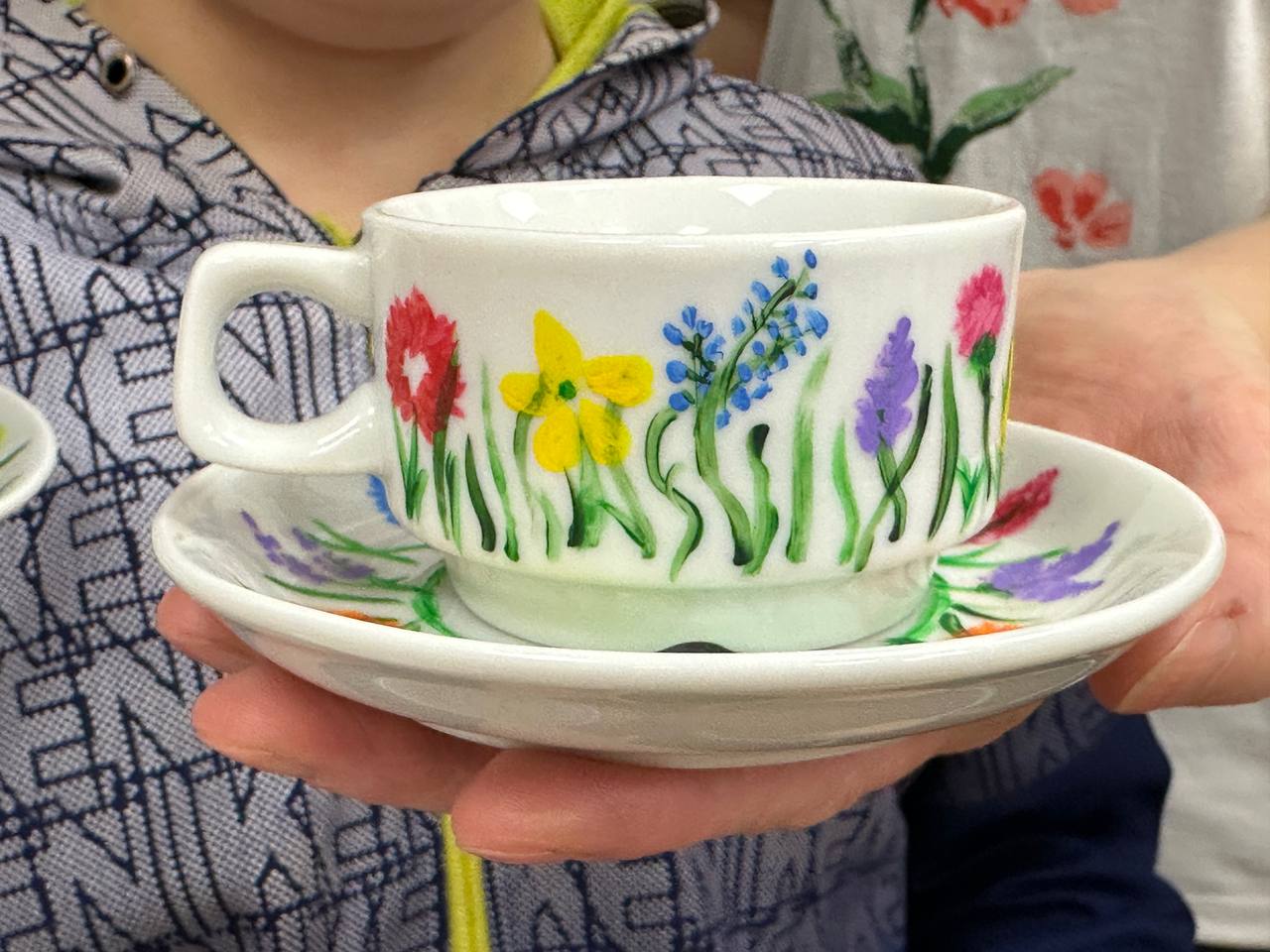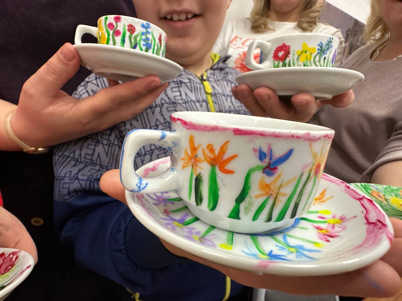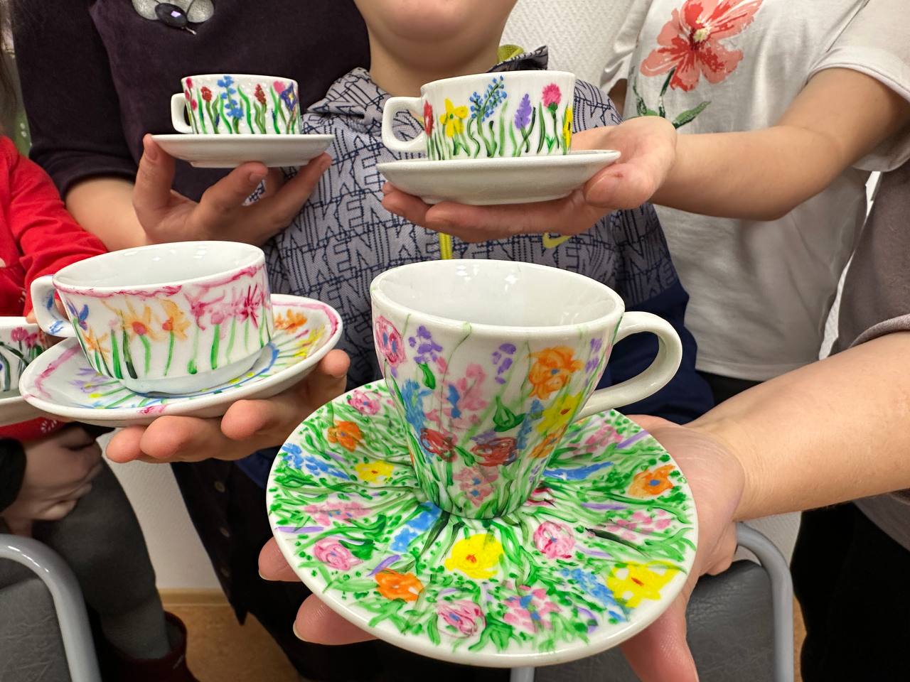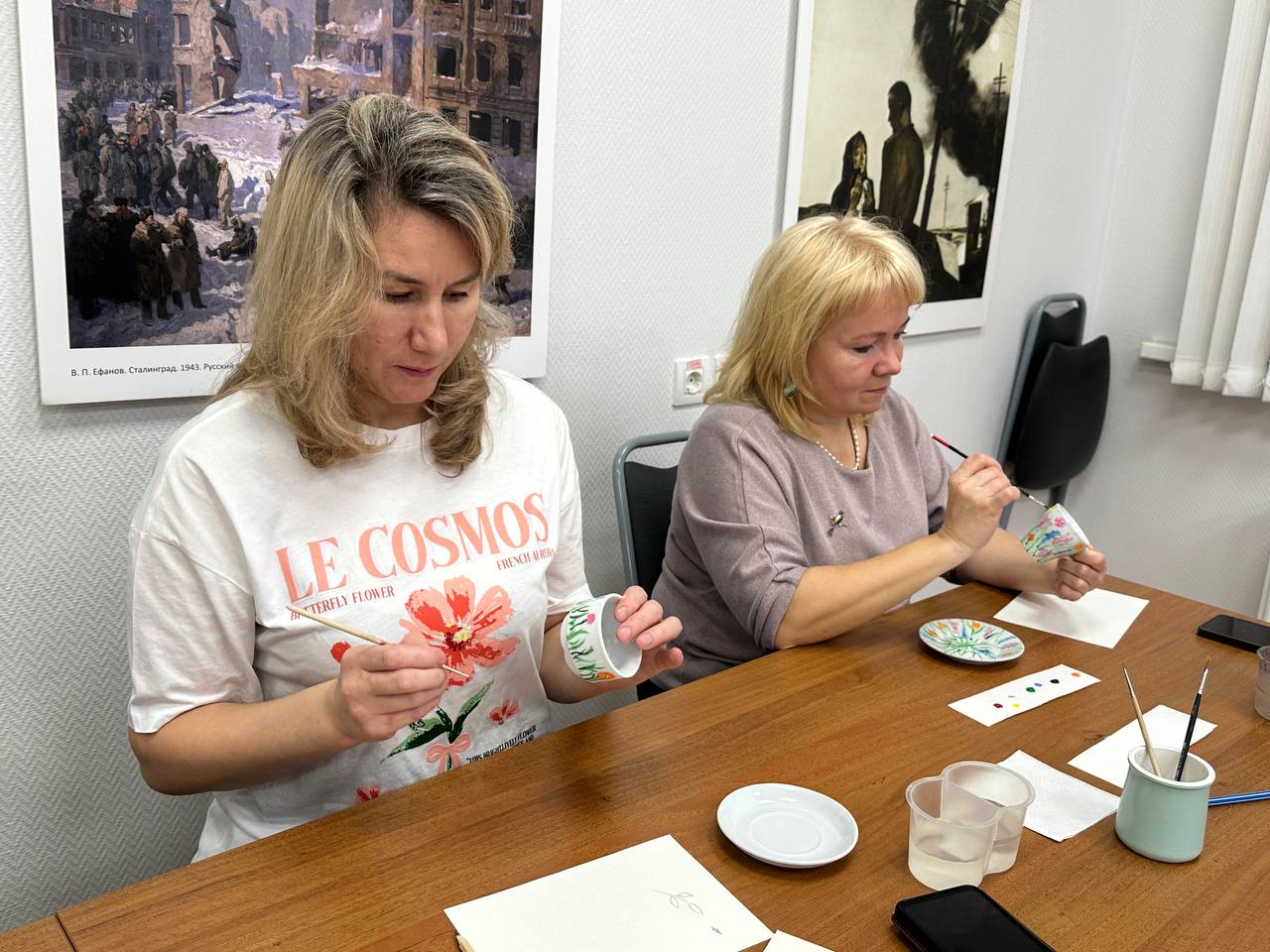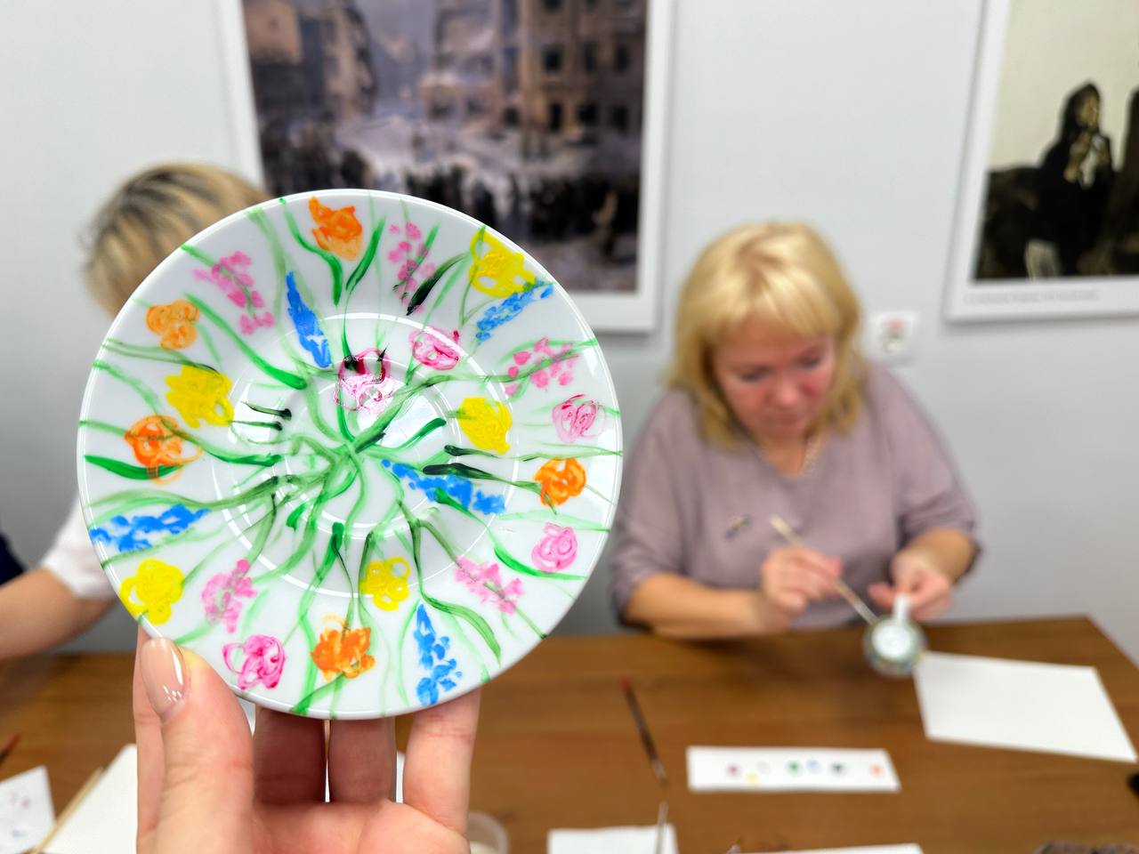 Гости с удовольствием окунулись в мир творчества, превращая обычные фарфоровые чашечки и блюдца в настоящие произведения искусства. Атмосфера была тёплой и вдохновляющей: каждый участник сосредоточенно работал над своим изделием, внимательно прорисовывая узоры и уделяя внимание каждой мелочи.
