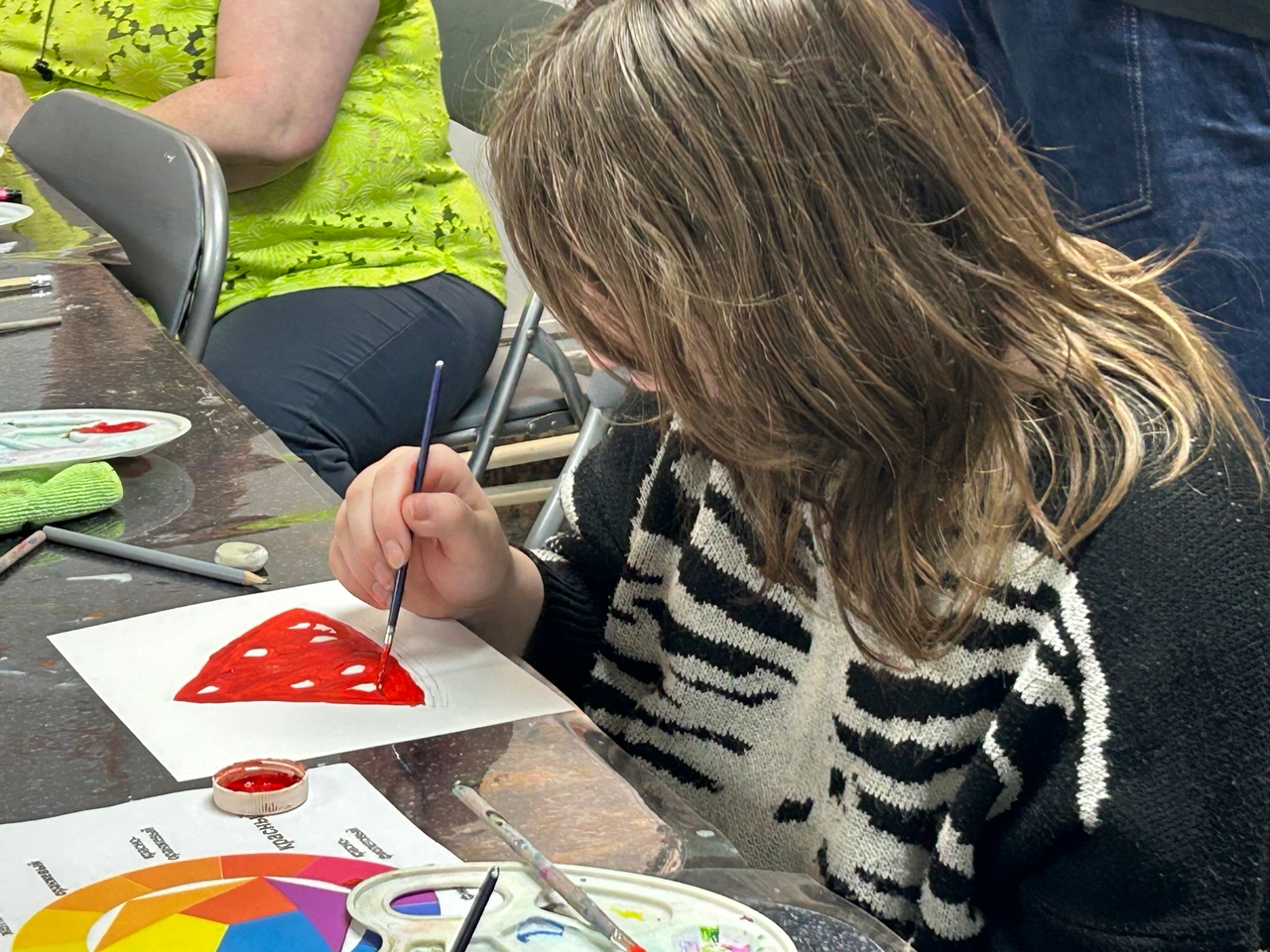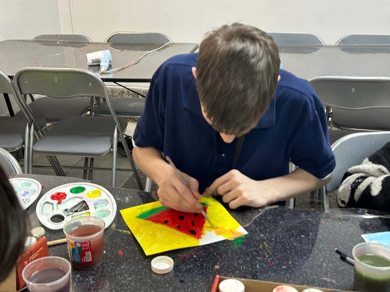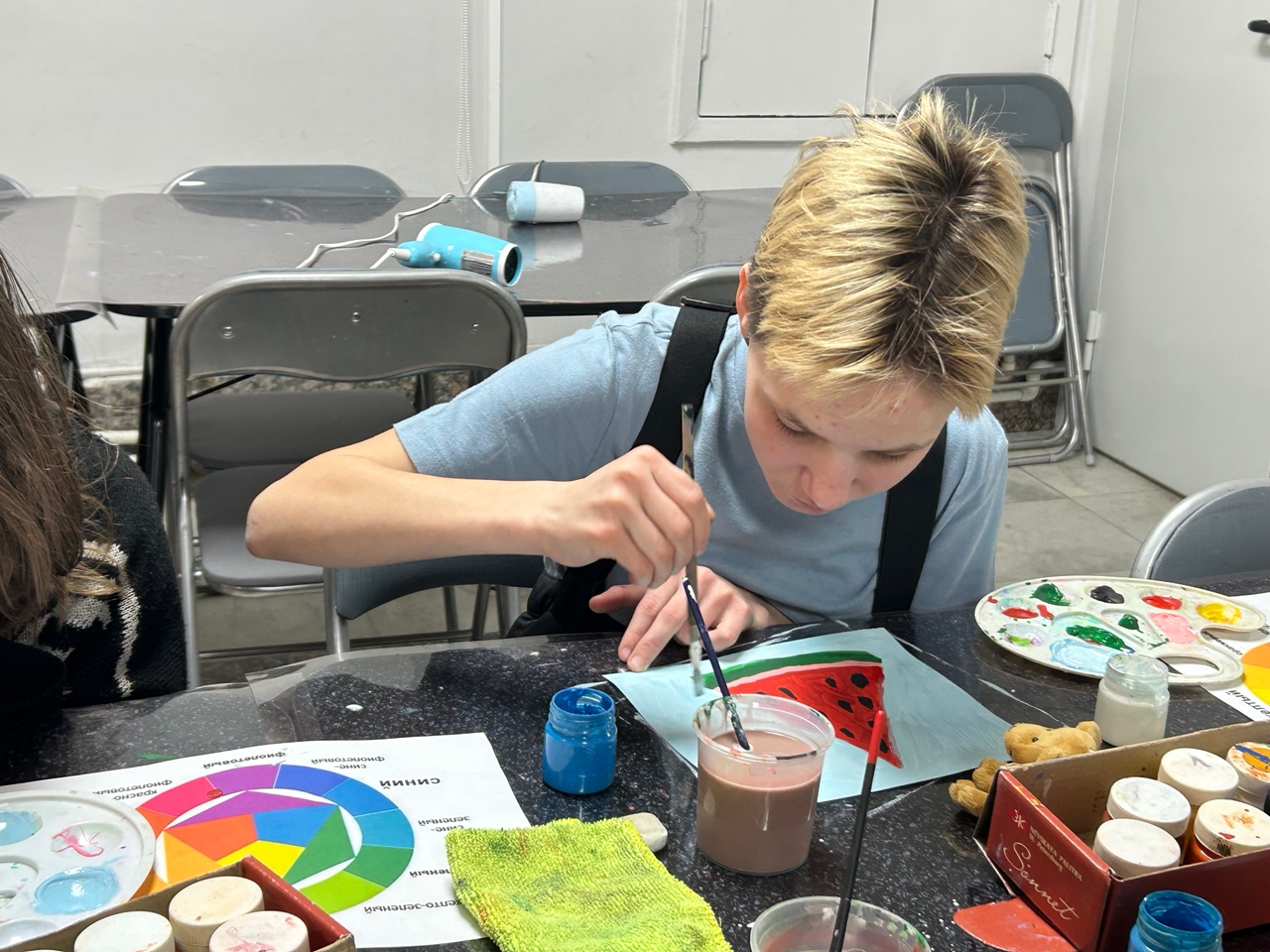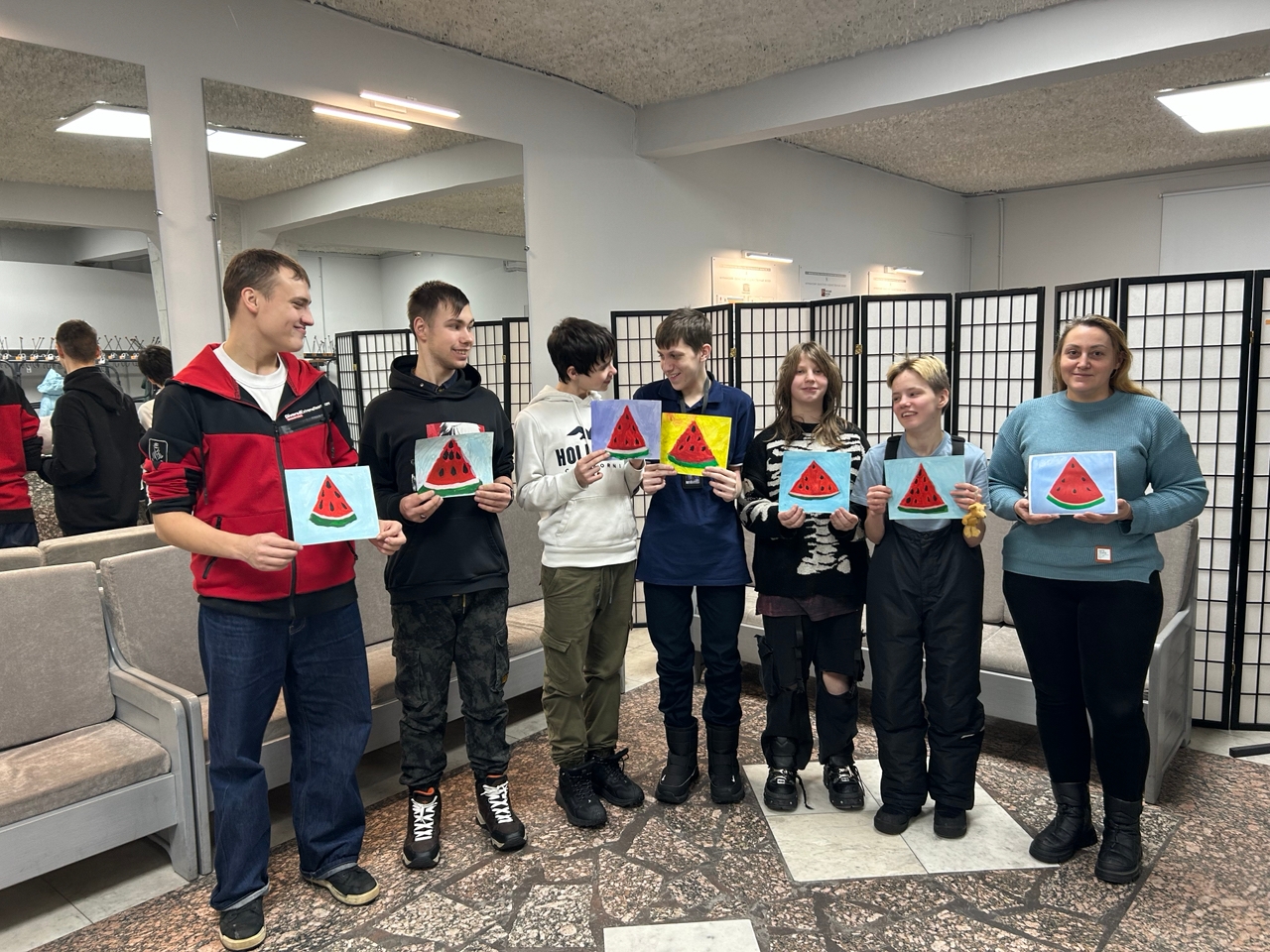 На встрече ребята познакомились с основами колористики и цветообразования. Внимательно изучили цветовой круг и узнали об основных контрастных парах. Основная задача творческой части заключалась в том, чтобы создать рисунок в красно-зеленой контрастной цветовой гамме. Участники встречи отлично справились с поставленной задачей, нарисовав арбузную дольку в технике гуашь.