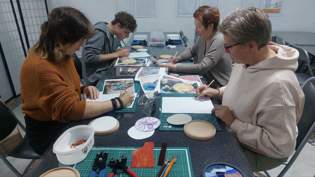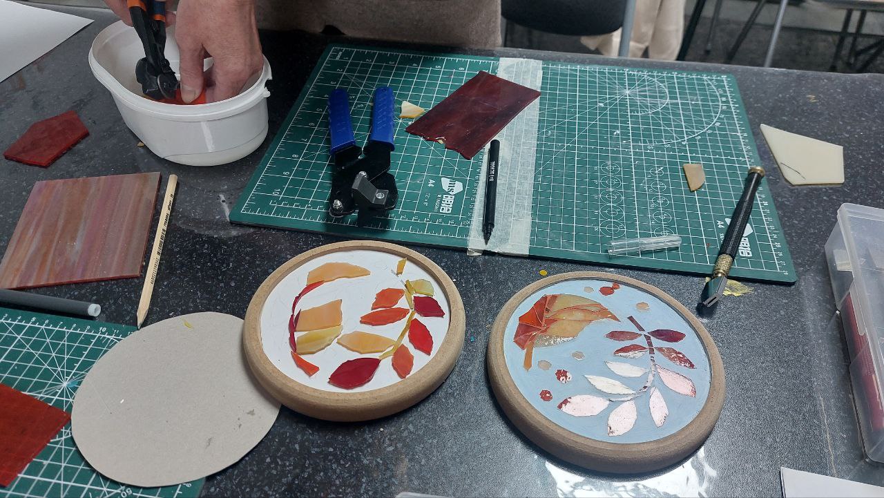 Участники встречи впервые взяли в руки кусачки и стеклорезы и попробовали свои силы в наколке модулей, а это не так-то просто, как кажется, этот процесс требует физических усилий и точности! Наши посетители упорно тренировались и в наборе, и в монтаже тессер на специально подготовленные арт-боарды.