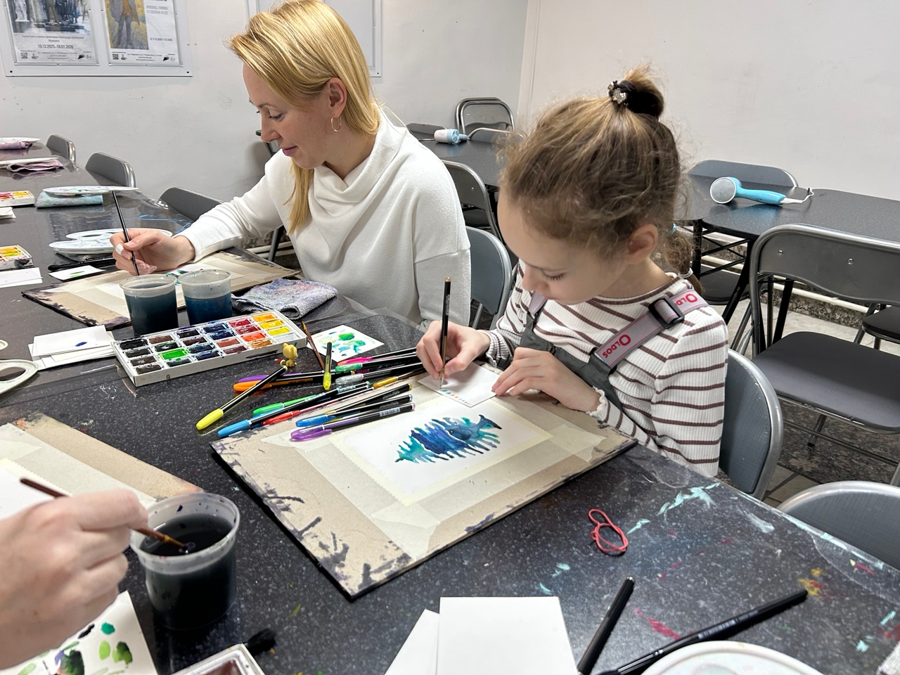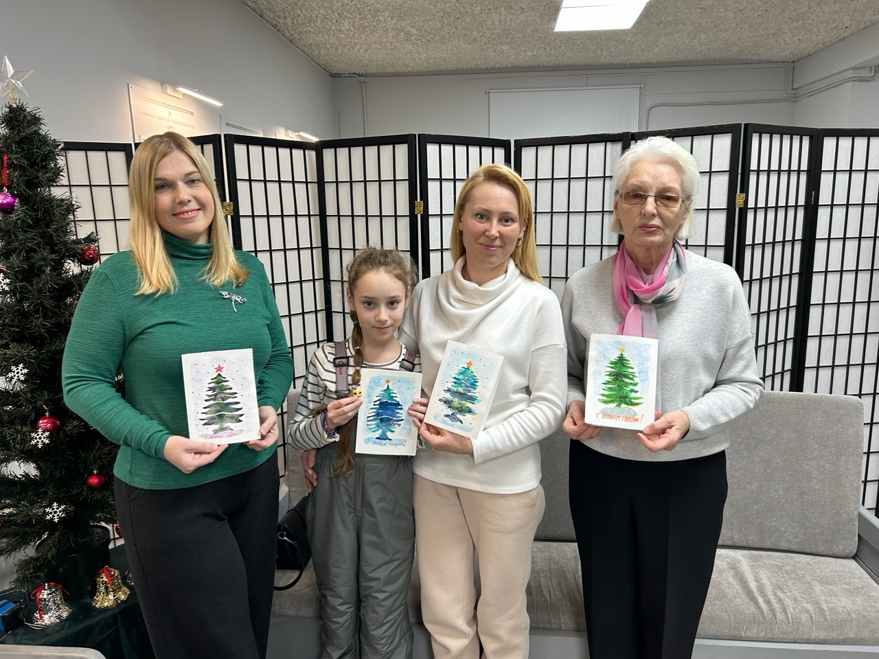 Участники встречи создали новогоднюю открытку в акварельной технике, используя дополнительно фигурную резку бумаги. Каждая открытка получилось уникальной благодаря тому, что новоиспеченные художники выбирали цвета самостоятельно, опираясь на внутренние ощущения, представляя какой должна быть именно их личная новогодняя елка.