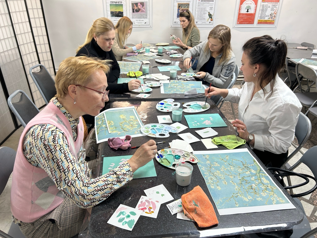 В этот раз на встрече неравнодушных к творчеству людей мы рисовали «Цветущие ветки миндаля». Эта картина была особенной для Винсента Ван Гога, ведь он написал ее в честь рождения его племянника и тезки, сына его брата Тео. Как выяснилось, особенной она оказалась не только для художника, но и для прекрасных участниц мастер-класса. Каждая гостья музея с трепетом подбирала и оттенок бирюзового для неба, и нежный розовый для цветков и бутонов, и холодный оливковый для ветвей… Итогом встречи стали чудесные картины, пропитанные духом Винсента Ван Гога.