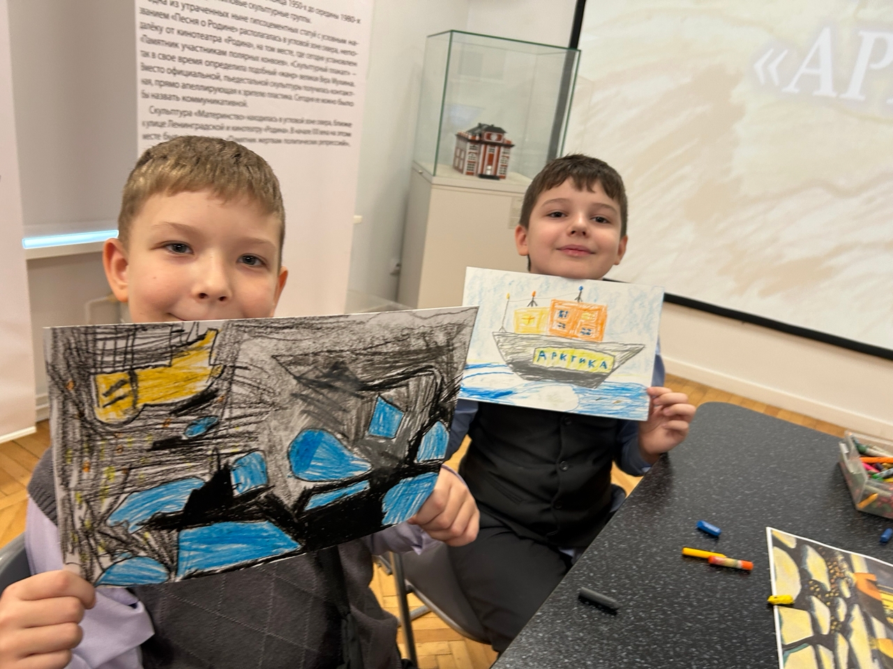 Ребята начали занятие в зале постоянной экспозиции «Отечественное изобразительное искусство XVII-XXI вв.», где познакомились с работами Арви Хуттунена, Виталия Бубенцова и Владимира Кумашова. А в пространстве Умной гостиной участники встречи узнали, что в прошлом объединяло этих художников - увлекательное путешествие на ледоколах в составе творческой группы «Арктика» по Северному морскому пути.