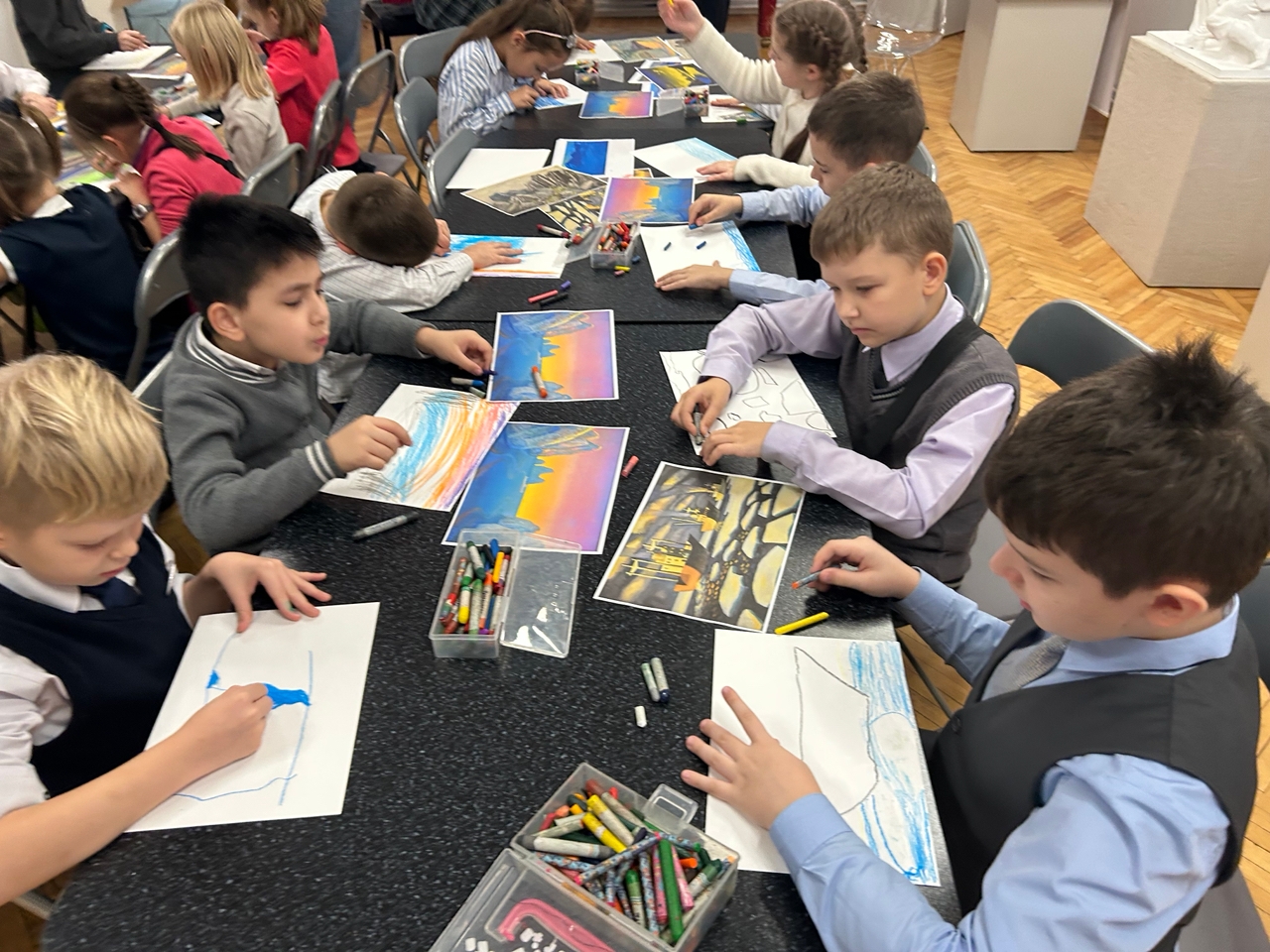 Музейный урок завершился творческим заданием, в ходе выполнения которого, ребята повторили арктические пейзажи, работая масляной пастелью.